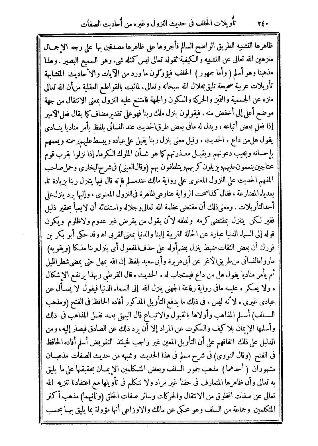 (وأما جمهور) الخلف فيؤوّلون ما ورد من الآيات والأحاديث المتشابهة تأويلات عربية صحيحة تليق بجلال الله سبحانه وتعالى، لما ثبت بالقواطع العقلية من أن الله تعالى منزه عن الجسمية والتميز والحركة والسكون والجهة فامتنع عليه النزول بمعنى الانتقال من جهة موضع أعلى إلى أخفض منه، فيقولون ينزل ملك ربنا فهو على تقدير مضاف كما يقال فعل الأمير إذا فعل بعض أتباعه، ويدل له ما في بعض طرق الحديث عند النسائي بلفظ يأمر مناديًا ينادي يقول هل من داع "الحديث" وقيل معنى ينزل ربنا يقبل على عبادة ويبسط عليهم رحمته ويعمهم بإحسانه ويجيب دعوتهم ويقبل معذرتهم كما هو شأن الملوك الكرماء إذا نزلوا بقرب قوم محتاجين ينعمون عليهم ويزيلون كربهم ويتلطفون بهم