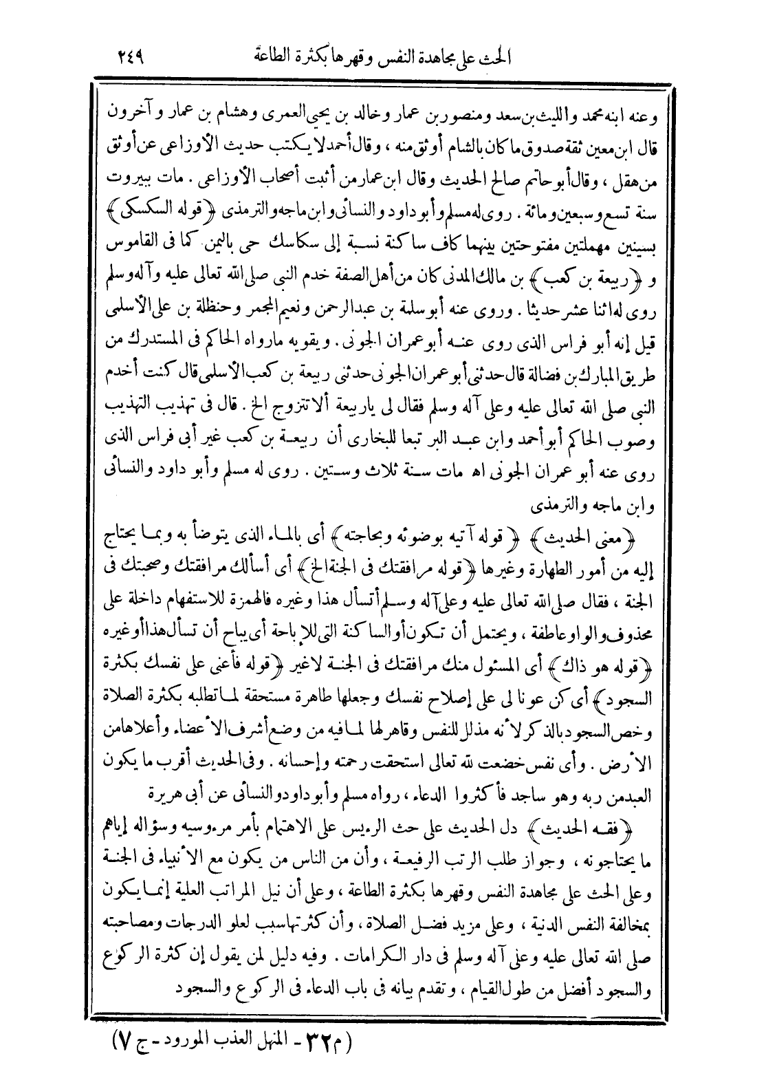 (فقه الحديث) دل الحديث على حث الرءيس على الأهتمام بأمر مرءوسيه وسؤاله إياهم ما يحتاجونه، وجواز طلب الرتب الرفيعة، وأن من الناس من يكون مع الأنبياء في الجنة وعلى الحث على مجاهدة النفس وقهرها بكثرة الطاعة، وعلى أن نيل المراتب العلية إنما يكون بمخالفة النفس الدنية، وعلى مزيد فضل الصلاة، وأن كثرتها سبب لعلو الدرجات ومصاحبته صلى الله تعالى عليه وعلى آله وسلم في دار الكرامات. وفيه دليل لمن يقول إن كثرة الركوع والسجود أفضل من طول القيام، وتقدم بيانه في باب الدعاء في الركوع والسجود