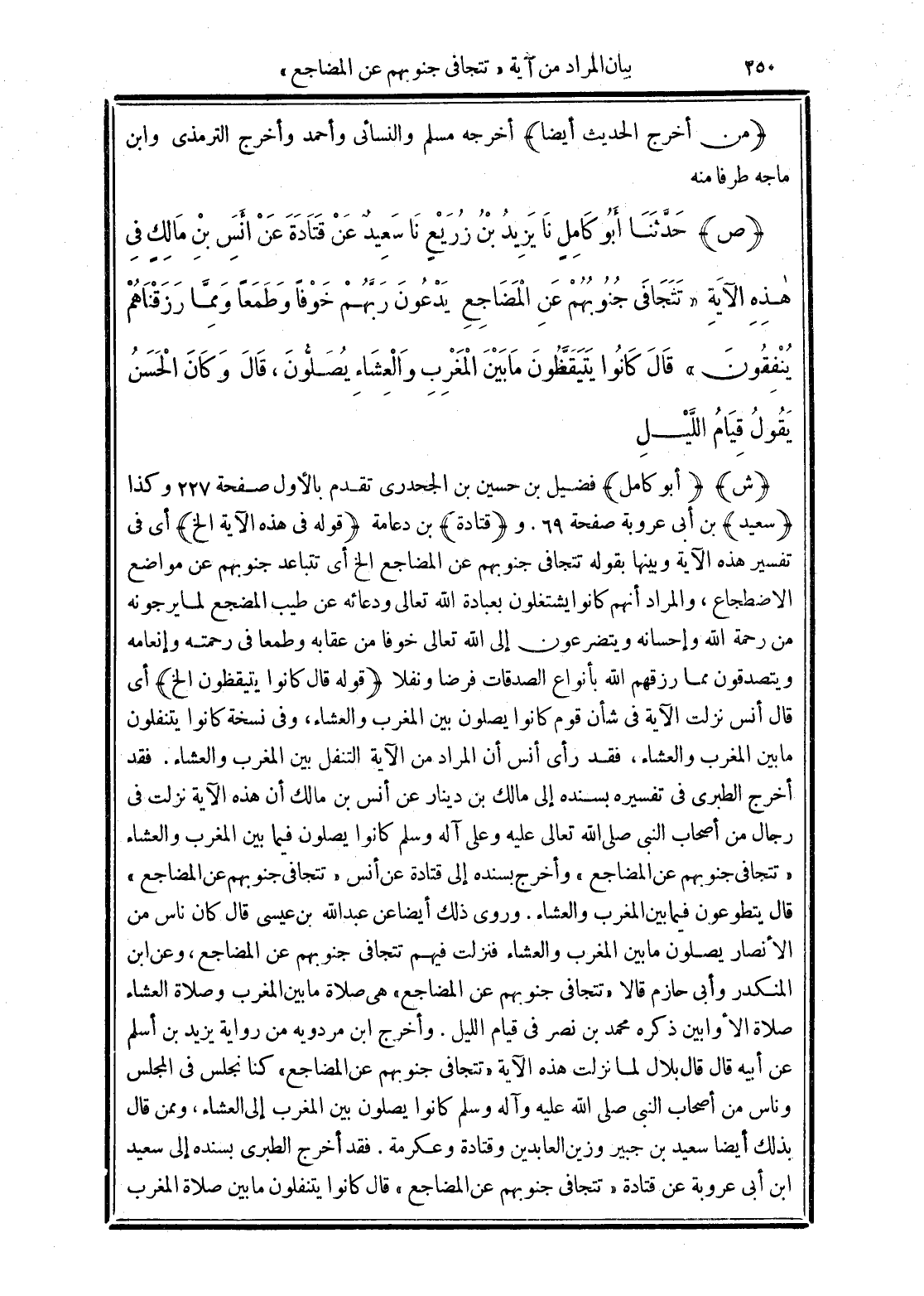 (ص) حَدَّثَنَا أَبُو كَامِلٍ نَا يَزِيدُ بْنُ زُرَيْعٍ نَا سَعِيدٌ عَنْ قَتَادَةَ عَنْ أَنَسِ بْنِ مَالِكٍ فِي هَذِهِ الآيَةِ {تَتَجَافَى جُنُوبُهُمْ عَنِ الْمَضَاجِعِ يَدْعُونَ رَبَّهُمْ خَوْفًا وَطَمَعًا وَمِمَّا رَزَقْنَاهُمْ يُنْفِقُونَ} قَالَ: كَانُوا يَتَيَقَّظُونَ مَا بَيْنَ الْمَغْرِبِ وَالْعِشَاءِ يُصَلُّونَ وَكَانَ الْحَسَنُ يَقُولُ: قِيَامُ اللَّيْلِ.