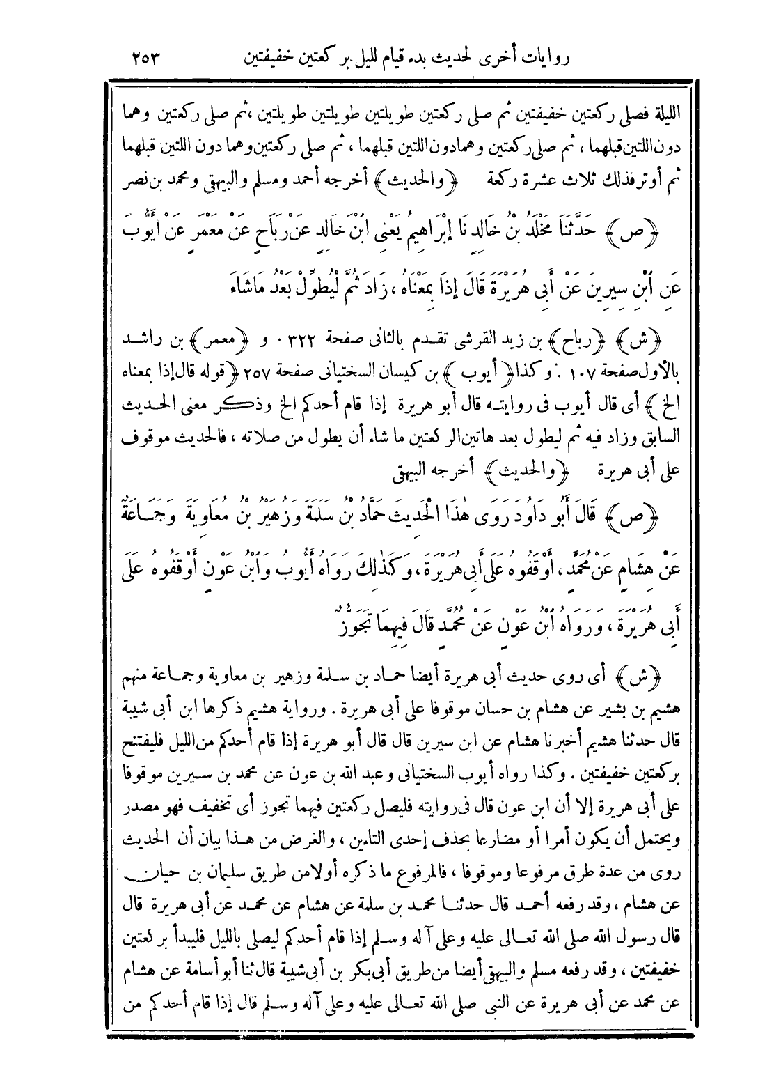 (ش) أي روى حديث أبي هريرة أيضًا حماد بن سلمة وزهير بن معاوية وجماعة منهم هشيم بن بشير عن هشام بن حسان موقوفًا على أبي هريرة. ورواية هشيم ذكرها ابن أبي شيبة قال حدثنا هشيم أخبرنا هشام عن ابن سيرين قال قال أبوهريرة إذا قام أحدكم من الليل فليفتتح بركعتين خفيفتين. وهذا رواه أيوب السختياني وعبد الله بن عون عن محمد بن سيرين موقوفًا على أبي هريرة إلا أن ابن عون قال في روايته فليصل ركعتين فيهما تجوز أي تخفيف فهو مصدر ويحتمل أن يكون أمرًا أو مضارعًا بحذف إحدى التاءين، والغرض من هذا بيان أن الحديث روى من عدة طرق مرفوعًا وموقوفًا، فالمرفوع ما ذكره أولًا من طريق سليمان بن حيان عن هشام، وقد رفعه أحمد قال حدثنا محمد بن سلمة عن هشام عن محمد عن أبي هريرة قال قال رسول الله صلى الله تعالى عليه وعلى آله وسلم إذا قام أحدكم ليصلي بالليل فليبدأ بركعتين خفيفتين، وقد رفعه مسلم والبيهقي أيضًا من طريق أبي بكر بن أبي شيبة قال ثنا أبو أسامة عن هشام عن محمد عن أبي هريرة عن النيى صلى الله تعالى عليه وعلى آله وسلم قال إذا قام أحدكم من