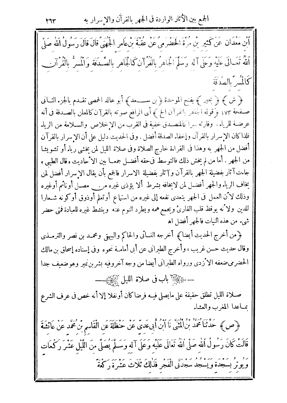 ابْنِ مَعْدَانَ عَنْ كَثِيرِ بْنِ مُرَّةَ الْحَضْرَمِيِّ عَنْ عُقْبَةَ بْنِ عَامِرٍ الْجُهَنِيِ قَالَ قَالَ رَسُولُ اللهِ -صلى الله عليه وسلم -: "الْجَاهِرُ بِالْقُرْآنِ كَالْجَاهِرِ بِالصَّدَقَةِ وَالْمُسِرُّ بِالْقُرْآنِ كَالْمُسِرِّ بِالصَّدَقَةِ".