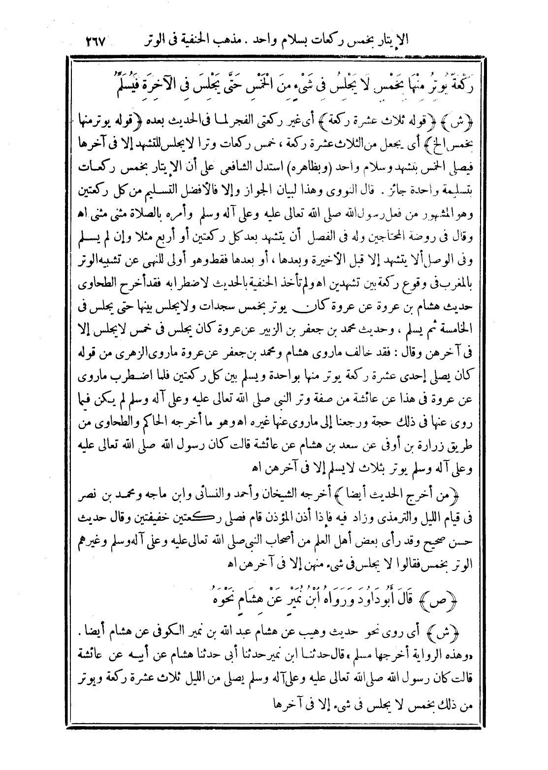 ولم تأخذ الحنفية بالحديث لاضطرابه فقد أخرح الطحاوي حديث هشام بن عروة عن عروة كان يوتر بخمس سجدات ولا يجلس بينها حتى يجلس في الخامسة ثم يسلم، وحديث محمَّد بن جعفر بن الزبير عن عروة كان يجلس في خمس لا يجلس إلا في آخرهن وقال: فقد خالف ما روى هشام ومحمد بن جعفر عن عروة ما روى الزهري من قوله كان يصلي إحدى عشرة ركعة يوتر منها بواحدة ويسلم بين كل ركعتين فلما اضطرب ما روى عن عروة في هذا عن عائشة من صفة وتر النبي صلى الله تعالى عليه وعلى آله وسلم لم يكن فيما روى عنها في ذلك حجة ورجعنا إلى ما روى عنها غيره اهـ وهو مما أخرجه الحاكم والطحاوي من طريق زرارة بن أوفى عن سعد بن هشام عن عائشة قالت كان رسول الله صلى الله تعالى عليه وعلى آله وسلم يوتر بثلاث لا يسلم إلا في آخرهن اهـ