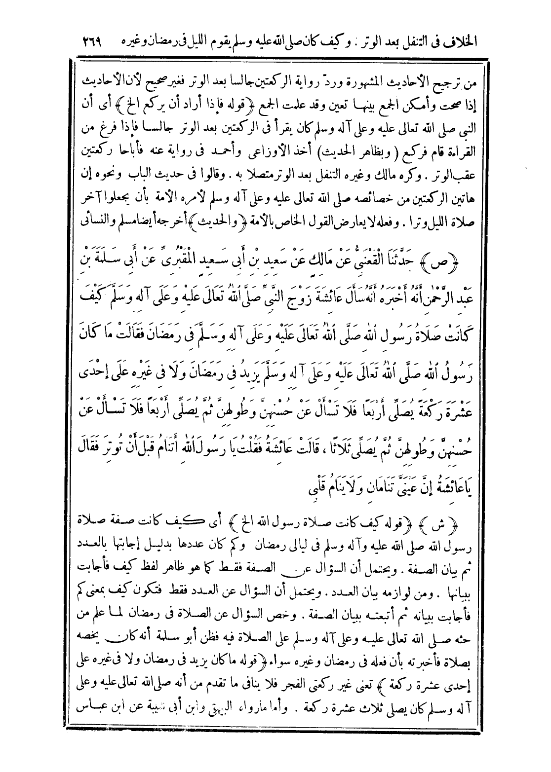 (ص) حَدَّثَنَا الْقَعْنَبِيُّ عَنْ مَالِكٍ عَنْ سَعِيدِ بْنِ أَبِي سَعِيدٍ الْمَقْبُرِيِّ عَنْ أَبِي سَلَمَةَ بْنِ عَبْدِ الرَّحْمَنِ أَنَّهُ أَخْبَرَهُ: أَنَّهُ سَأَلَ عَائِشَةَ زَوْجَ النَّبِيِّ -صَلَّى الله تَعَالَى عَلَيْهِ وَعَلَى آلِهِ وَسَلَّمَ- كَيْفَ كَانَتْ صَلاَةُ رَسُولِ اللَّهِ -صَلَّى الله تَعَالَى عَلَيْهِ وَعَلَى آلِهِ وَسَلَّمَ- فِي رَمَضَانَ فَقَالَتْ: مَا كَانَ رَسُولُ اللَّهِ -صَلَّى الله تَعَالَى عَلَيْهِ وَعَلَى آلِهِ وَسَلَّمَ- يَزِيدُ فِي رَمَضَانَ وَلاَ فِي غَيْرِهِ عَلَى إِحْدَى عَشْرَةَ رَكْعَةً: يُصَلِّي أَرْبَعًا فَلاَ تَسْأَلْ عَنْ حُسْنِهِنَّ وَطُولِهِنَّ ثُمَّ يُصَلِّي أَرْبَعًا فَلاَ تَسْأَلْ عَنْ حُسْنِهِنَّ وَطُولِهِنَّ ثُمَّ يُصَلِّي ثَلاَثًا قَالَتْ عَائِشَةُ فَقُلْتُ: يَا رَسُولَ اللَّهِ أَتَنَامُ قَبْلَ أَنْ تُوتِرَ قَالَ: "يَا عَائِشَةُ إِنَّ عَيْنَيَّ تَنَامَانِ وَلاَ يَنَامُ قَلْبِي".