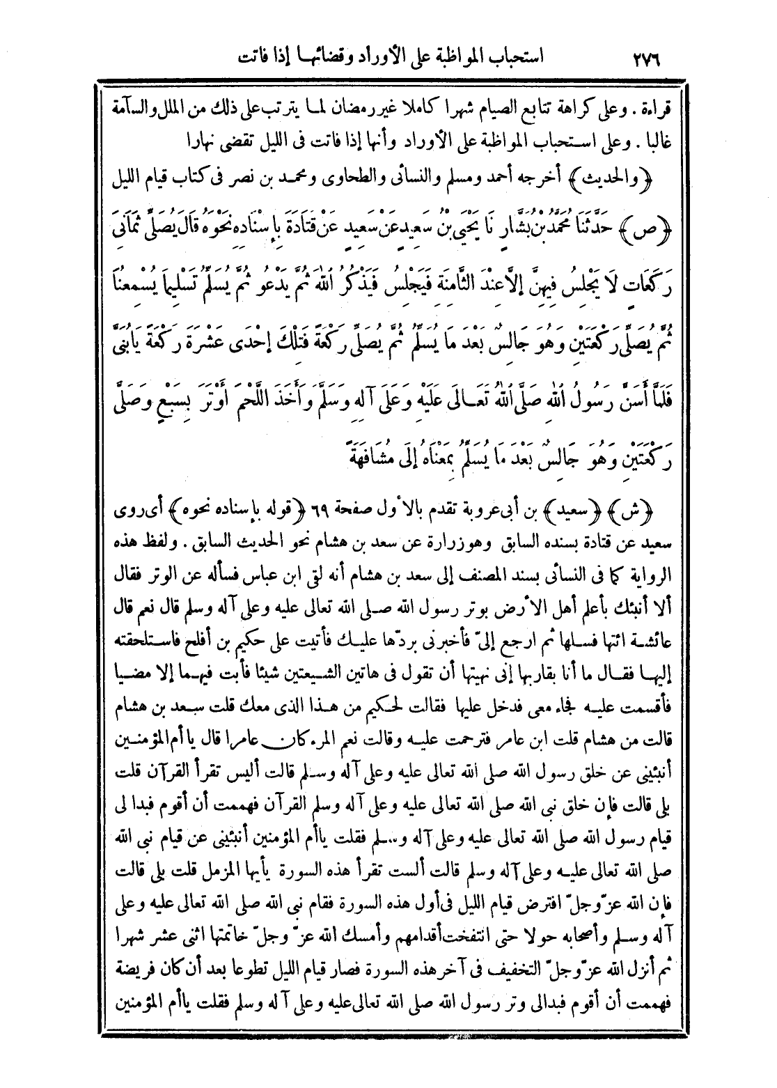 (قوله بإسناده نحوه) أي روى سعيد عن قتادة بسنده السابق وهو زرارة عن سعد بن هشام نحو الحديث السابق. ولفظ هذه الرواية كما في النسائي بسند المصنف إلى سعد بن هشام أنه لقي ابن عباس فسأله عن الوتر فقال ألا أنبئك بأعلم أهل الأرض بوتر رسول الله صلى الله تعالى عليه وعلى آله وسلم قال نعم قال عائشة ائتها فسلها ثم ارجع إليّ فأخبرني بردّها عليك فأتيت على حكيم بن أفلح فاستلحقته إليها فقال ما أنا بقاربها إني نهيتها أن تقول في هاتين الشيعتين شيئًا فأبت فيهما إلا مضيًا فأقسمت عليه فجاء معي فدخل عليها فقالت لحكيم من هذا الذي معك قلت سعد بن هشام قالت من هشام قلت ابن عامر فترحمت عليه وقالت نعم المرء كان عامرًا قال يا أم المؤمنين أنبئيني عن خلق رسول الله صلى الله تعالى عليه وعلى آله وسلم قالت أليس تقرأ القرآن قلت بلى قالت فإن خلق نبي الله صلى الله تعالى عليه وعلى آله وسلم القرآن فهممت أن أقوم فبدا لي قيام رسول الله صلى الله تعالى عليه وعلى آله وسلم فقلت يا أم المؤمنين أنبئيني عن قيام نبي الله صلى الله تعالى عليه وعلى آله وسلم قالت ألست تقرأ هذه السورة (يَاأَيُّهَا الْمُزَّمِّلُ) قلت بلى قالت فإن الله عَزَّ وَجَلَّ افترض قيام الليل في أول هذه السورة فقام نبي الله صلى الله تعالى عليه وعلى آله وسلم وأصحابه حولًا حتى انتفخت أقدامهم وأمسك الله عَزَّ وَجَلَّ خاتمتها اثنى عشر شهرًا ثم أنزل الله عَزَّ وَجَلَّ التخفيف في آخر هذه السورة فصار قيام الليل تطوعًا بعد أن كان فريضة فهممت أن أقوم فبدا لي وتر رسول الله صلى الله تعالى عليه وعلى آله وسلم فقلت يا أم المؤمنين