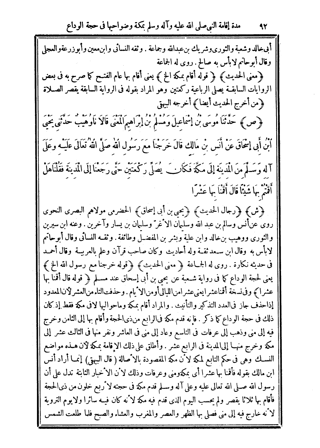 (قال البيهقي) إنما أراد أنس ابن مالك بقوله فأقمنا بها عشرًا أي بمكة ومنى وعرفات وذلك لأن الأخبار الثابتة تدل على أن رسول الله صلى الله تعالى عليه وعلى آله وسلم قدم مكة في حجته لأربع خلون من ذى الحجة فأقام بها ثلاثًا يقصر ولم يحسب اليوم الذي قدم فيه مكة لأنه كان فيه سائرًا ولا يوم التروية لأنه خارج فيه إلى منى فصلى بها الظهر والعصر والمغرب والعشاء والصبح فلما طلعت الشمس