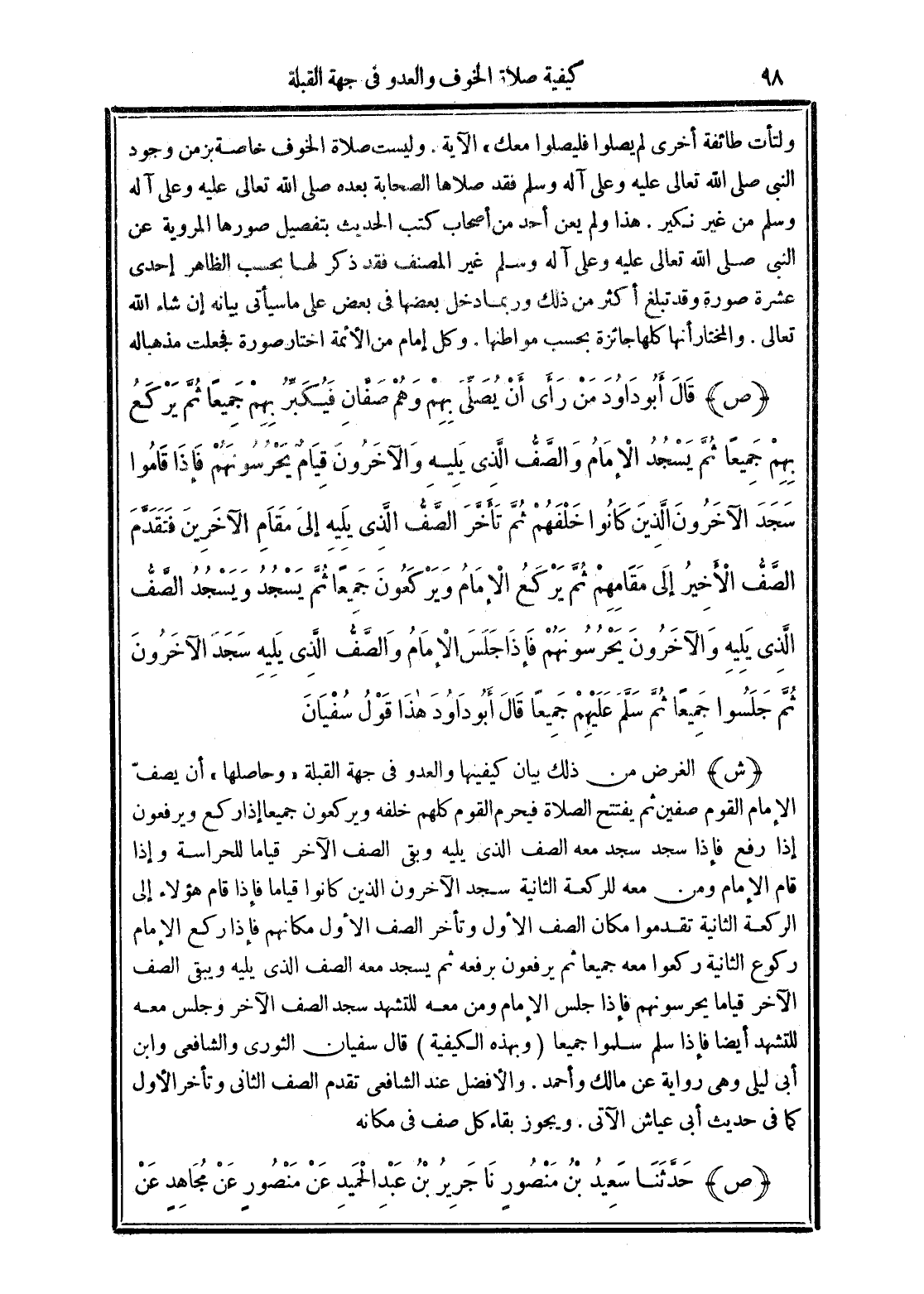 (ص) قَالَ أَبُو دَاوُدَ مَنْ رَأَى أَنْ يُصَلِّيَ بِهِمْ وَهُمْ صَفَّانِ فَيُكَبِّرُ بِهِمْ جَمِيعًا ثُمَّ يَرْكَعُ بِهِمْ جَمِيعًا ثُمَّ يَسْجُدُ الإِمَامُ وَالصَّفُّ الَّذِى يَلِيهِ وَالآخَرُونَ قِيَامٌ يَحْرُسُونَهُمْ فَإِذَا قَامُوا سَجَدَ الآخَرُونَ الَّذِينَ كَانُوا خَلْفَهُمْ ثُمَّ تَأَخَّرَ الصَّفُّ الَّذِى يَلِيهِ إِلَى مَقَامِ الآخَرِينَ وَتَقَدَّمَ الصَّفُّ الأَخِيرُ إِلَى مَقَامِهِمْ ثُمَّ يَرْكَعُ الإِمَامُ وَيَرْكَعُونَ جَمِيعًا ثُمَّ يَسْجُدُ وَيَسْجُدُ الصَّفُّ الَّذِى يَلِيهِ وَالآخَرُونَ يَحْرُسُونَهُمْ فَإِذَا جَلَسَ الإِمَامُ وَالصَّفُّ الَّذِى يَلِيهِ سَجَدَ الآخَرُونَ ثُمَّ جَلَسُوا جَمِيعًا ثُمَّ سَلَّمَ عَلَيْهِمْ جَمِيعًا. قَالَ أَبُو دَاوُدَ هَذَا قَوْلُ سُفْيَانَ.