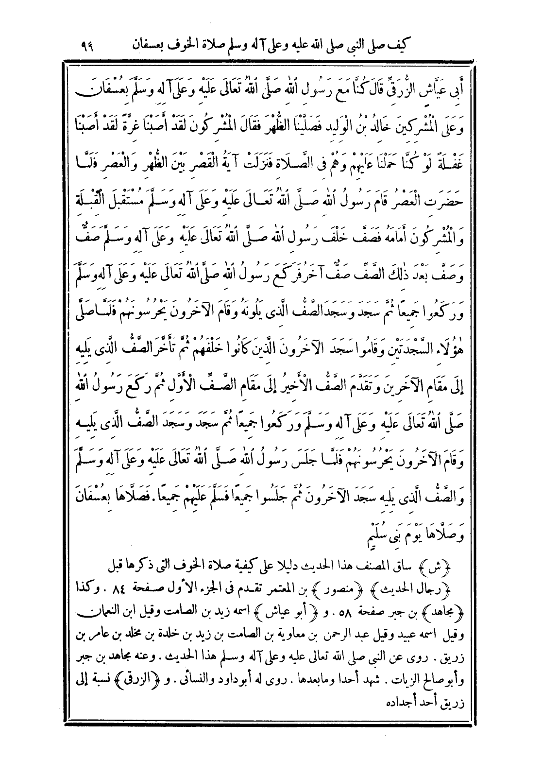 أَبِي عَيَّاشٍ الزُّرَقِيِّ قَالَ كُنَّا مَعَ رَسُولِ اللَّهِ -صَلَّى الله تَعَالَى عَلَيْهِ وَعَلَى آلِهِ وَسَلَّمَ- بِعُسْفَانَ وَعَلَى الْمُشْرِكِينَ خَالِدُ بْنُ الْوَلِيدِ فَصَلَّيْنَا الظُّهْرَ فَقَالَ الْمُشْرِكُونَ لَقَدْ أَصَبْنَا غِرَّةً لَقَدْ أَصَبْنَا غَفْلَةً لَوْ كُنَّا حَمَلْنَا عَلَيْهِمْ وَهُمْ فِي الصَّلاَةِ فَنَزَلَتْ آيَةُ الْقَصْرِ بَيْنَ الظُّهْرِ وَالْعَصْرِ فَلَمَّا حَضَرَتِ الْعَصْرُ قَامَ رَسُولُ اللَّهِ -صَلَّى الله تَعَالَى عَلَيْهِ وَعَلَى آلِهِ وَسَلَّمَ- مُسْتَقْبِلَ الْقِبْلَةِ وَالْمُشْرِكُونَ أَمَامَهُ فَصَفَّ خَلْفَ رَسُولِ اللَّهِ -صَلَّى الله تَعَالَى عَلَيْهِ وَعَلَى آلِهِ وَسَلَّمَ- صَفٌّ وَصَفَّ بَعْدَ ذَلِكَ الصَّفِّ صَفٌّ آخَرُ فَرَكَعَ رَسُولُ اللَّهِ -صَلَّى الله تَعَالَى عَلَيْهِ وَعَلَى آلِهِ وَسَلَّمَ- وَرَكَعُوا جَمِيعًا ثُمَّ سَجَدَ وَسَجَدَ الصَّفُّ الَّذِينَ يَلُونَهُ وَقَامَ الآخَرُونَ يَحْرُسُونَهُمْ فَلَمَّا صَلَّى هَؤُلاَءِ السَّجْدَتَيْنِ وَقَامُوا سَجَدَ الآخَرُونَ الَّذِينَ كَانُوا خَلْفَهُمْ ثُمَّ تَأَخَّرَ الصَّفُّ الَّذِى يَلِيهِ إِلَى مَقَامِ الآخَرِينَ وَتَقَدَّمَ الصَّفُّ الأَخِيرُ إِلَى مَقَامِ الصَّفِّ الأَوَّلِ ثُمَّ رَكَعَ رَسُولُ اللَّهِ -صَلَّى الله تَعَالَى عَلَيْهِ وَعَلَى آلِهِ وَسَلَّمَ- وَرَكَعُوا جَمِيعًا ثُمَّ سَجَدَ وَسَجَدَ الصَّفُّ الَّذِى يَلِيهِ وَقَامَ الآخَرُونَ يَحْرُسُونَهُمْ فَلَمَّا جَلَسَ رَسُولُ اللَّهِ -صَلَّى الله تَعَالَى عَلَيْهِ وَعَلَى آلِهِ وَسَلَّمَ- وَالصَّفُّ الَّذِى يَلِيهِ سَجَدَ الآخَرُونَ ثُمَّ جَلَسُوا جَمِيعًا فَسَلَّمَ عَلَيْهِمْ جَمِيعًا فَصَلاَّهَا بِعُسْفَانَ وَصَلاَّهَا يَوْمَ بَنِي سُلَيْمٍ.