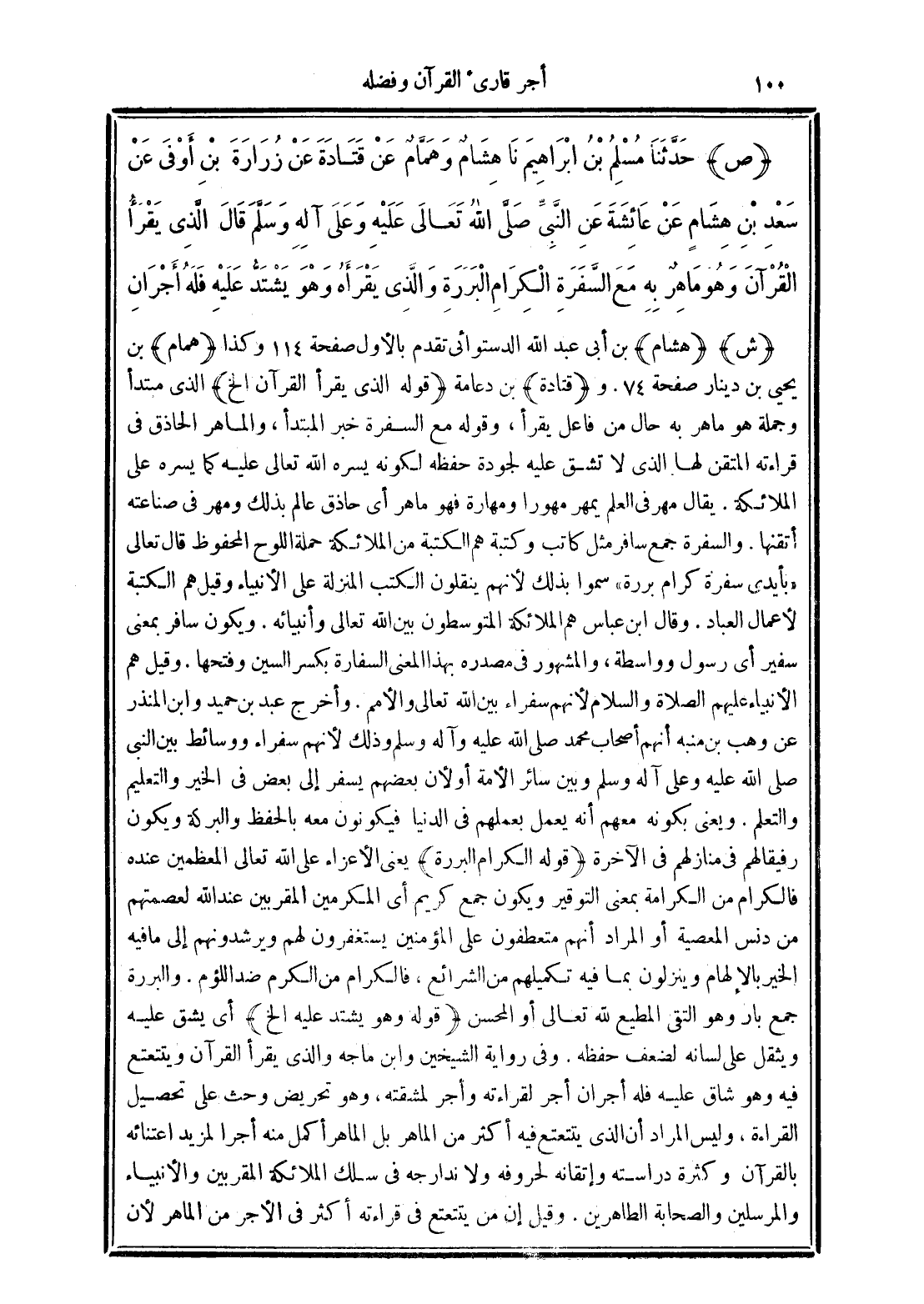 (ص) حَدَّثَنَا مُسْلِمُ بْنُ إِبْرَاهِيمَ نَا هِشَامٌ وَهَمَّامٌ عَنْ قَتَادَةَ عَنْ زُرَارَةَ بْنِ أَوْفَى عَنْ سَعْدِ بْنِ هِشَامٍ عَنْ عَائِشَةَ عَنِ النَّبِيِّ -صَلَّى الله تَعَالَى عَلَيْهِ وَعَلَى آلِهِ وَسَلَّمَ- قَالَ "الَّذِي يَقْرَأُ الْقُرْآنَ وَهُوَ مَاهِرٌ بِهِ مَعَ السَّفَرَةِ الْكِرَامِ الْبَرَرَةِ وَالَّذِى يَقْرَؤُهُ وَهُوَ يَشْتَدُّ عَلَيْهِ فَلَهُ أَجْرَانِ".