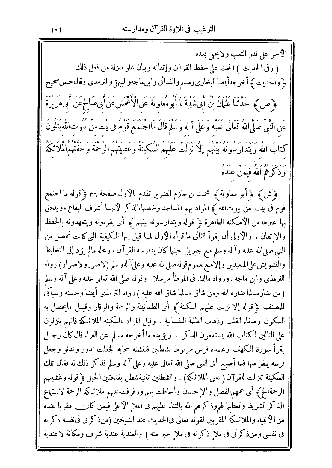(قوله ما اجتمع قوم في بيت من بيوت الله) المراد بهم المساجد وخصها بالذكر لأنها أشرف البقاع ويلحق بها غيرها من الأمكنه الطاهره