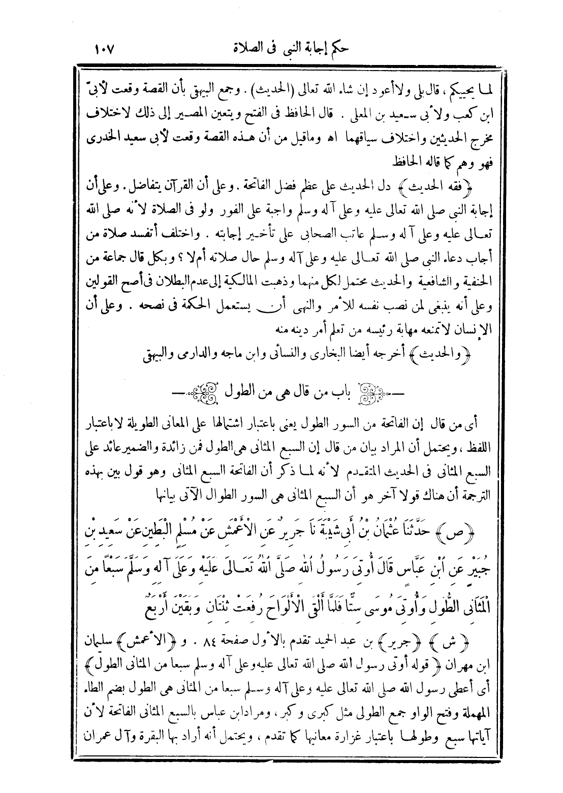 (فقه الحديث) دل الحديث على عظم فضل الفاتحة. وعلى أن القرآن يتفاضل. وعلى أن إجابه النبي صلى الله تعالى وعلى آله وسلم واجبه على الفور ولو في الصلاة لأنه صلى الله عليه وسلم عاتب الصحابي على تأخير إجابته. واختلف أتفسد صلاة من أجاب دعاء النبي صلى الله تعالى وعلى آله وسلم حال صلاته أم لا؟ وبكل قال جماعة من الحنفية والشافعية والحديث محتمل لكل منهما وذهبت المالكية إلى عدم البطلان في أصح القولين وعلى إنه ينبغي لمن نصب نفسه للأمر والنهي أن يستعمل الحكمة في نصحه. وعلى أن الإنسان لا تمنعه مهابه رئيسيه من تعلم أمر دينه منه.