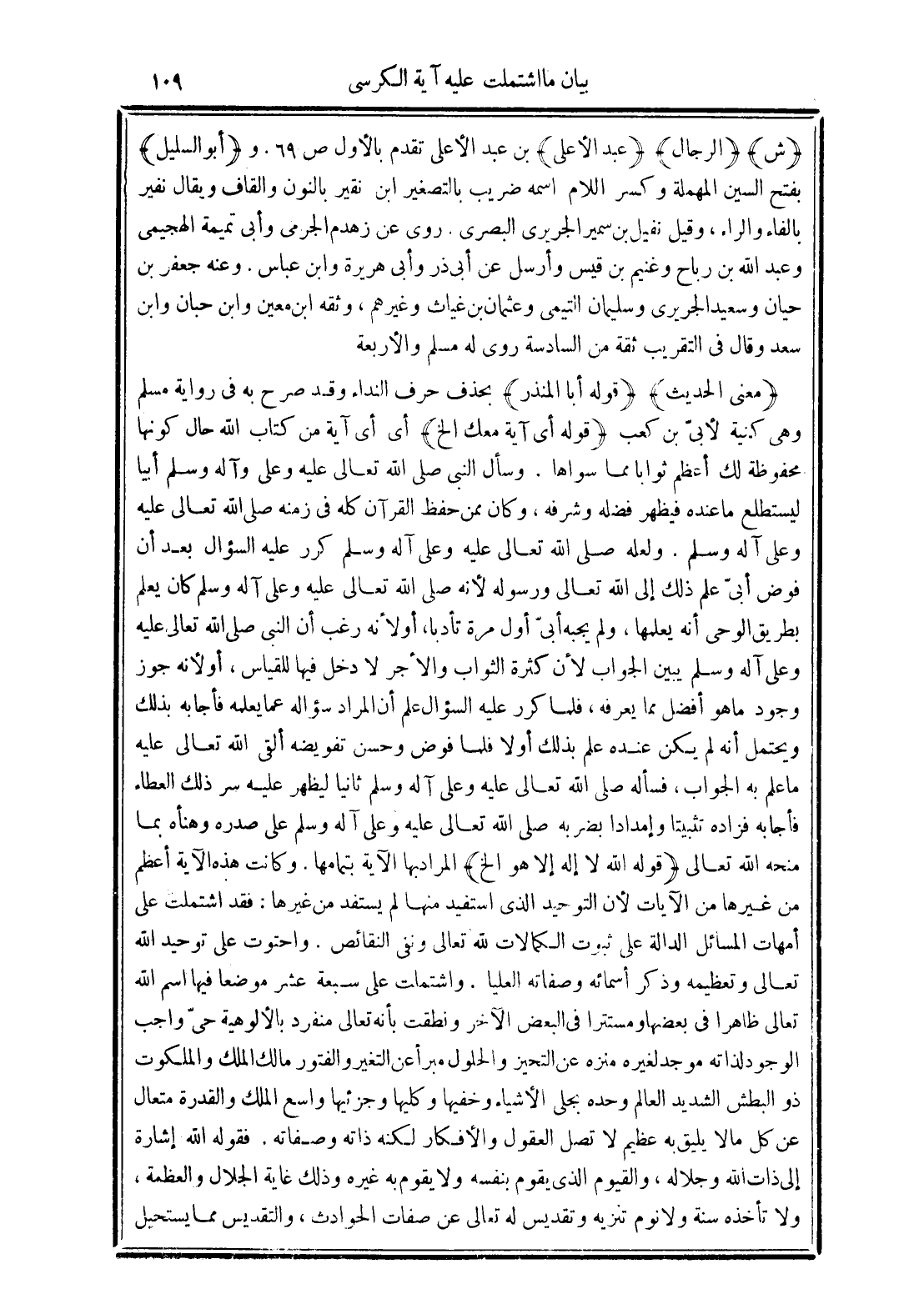 (قوله الله لا إله إلا هو الخ) المراد بها الآية بتمامها. وكانت هذه الآية أعظم من غيرها من الآيات لأن التوحيد الذي استفيد منها لم يستفد من غيرها: فقد اشتملت على أمهات المسائل الدالة على ثبوت الكمالات لله تعالى ونفي النقائص. واحتوت على توحيد الله تعالى وتعظيمه وذكر أسمائه وصفاته العليا. واشتملت على سبعة عشر موضوعًا فيها اسم الله تعالى ظاهرًا في بعضها ومستترا في البعض الآخر ونطقت بأنه تعالى منفرد بالألوهيه حي واجب الوجود لذاته موجد لغيره منزه عن التحيز والحلول مبرأ عن التغير والفتور مالك الملك والملكوت ذو البطش الشديد العالم وحده بجلي الأشياء وخفيها وكليها وجزئيها واسع الملك والقدرة متعال عن كل ما لا يليق به عظيم لا تصل العقول والأفكار لكنه ذاته وصفاته.