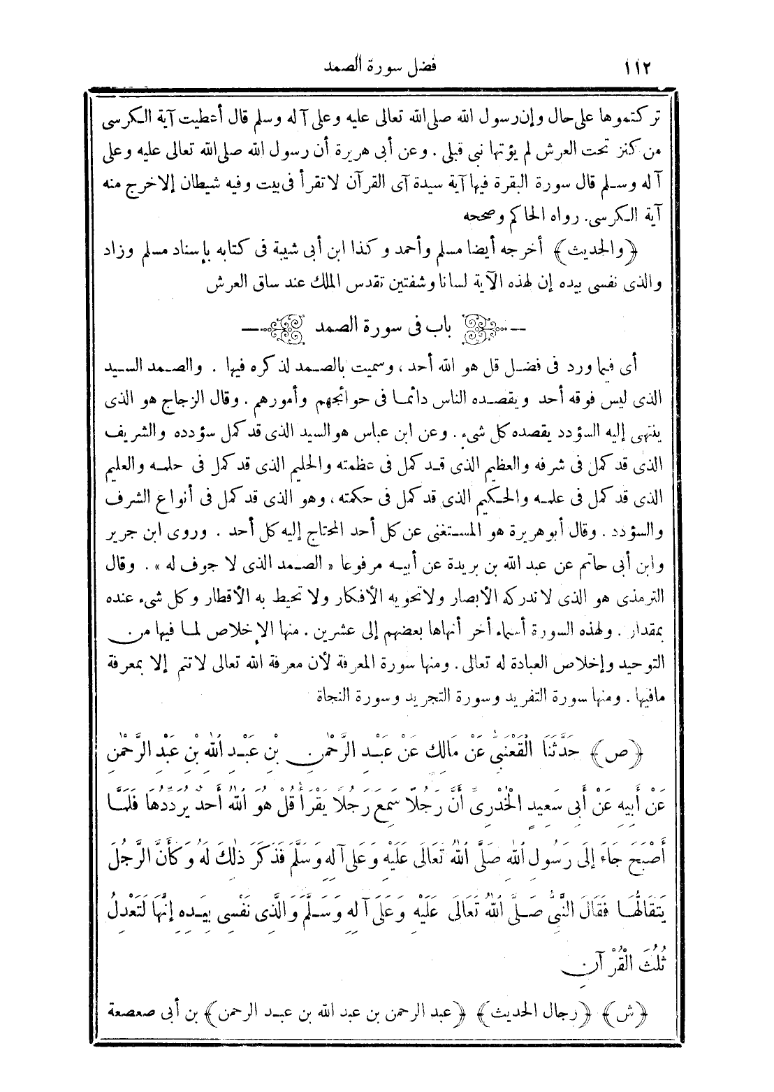 أي فيما ورد في فضل قل هو الله أحد, وسميت بالصمد لذكره فيها. والصمد السيد الذي ليس فوقه أحد ويقصده الناس دائمًا في حوائجهم وأمورهم. وقال الزجاج هو الذي ينتهي إليه السؤدد يقصده كل شيء. وعن ابن عباس هو السيد الذي قد كمل سؤدده والشريف الذي قد كمل في شرفه والعظيم الذي قد كمل في عظمته والحليم الذي قد كمل في حلمه والعليم الذي قد كمل في علمه والحكيم الذي قد كمل في حكمته, وهو الذي قد كمل في أنواع الشرف والسؤدد. وقال أبوهريرة هو المستغنى عن كل أحد المحتاج إليه كل أحد. وروى ابن جرير وابن حاتم عن عبد الله بن بريده عن أبيه مرفوعًا "الصمد الذي لا جوف له". وقال الترمذي هو الذي لا تدركه الأبصار ولا تحويه الأفكار ولا تحيط به الأقطار وكل شيء عنده بمقدار ولهذه السورة أسماء أخر أنهاها بعضهم إلى عشرين. منها الإخلاص لما فيها من التوحيد وإخلاص العبادة له تعالى. ومنها سورة المعرفه لأن معرفه الله تعالى لا تتم إلا بمعرفه ما فيها. ومنها سورة التفريد وسوره التجريد وسوره النجاة
