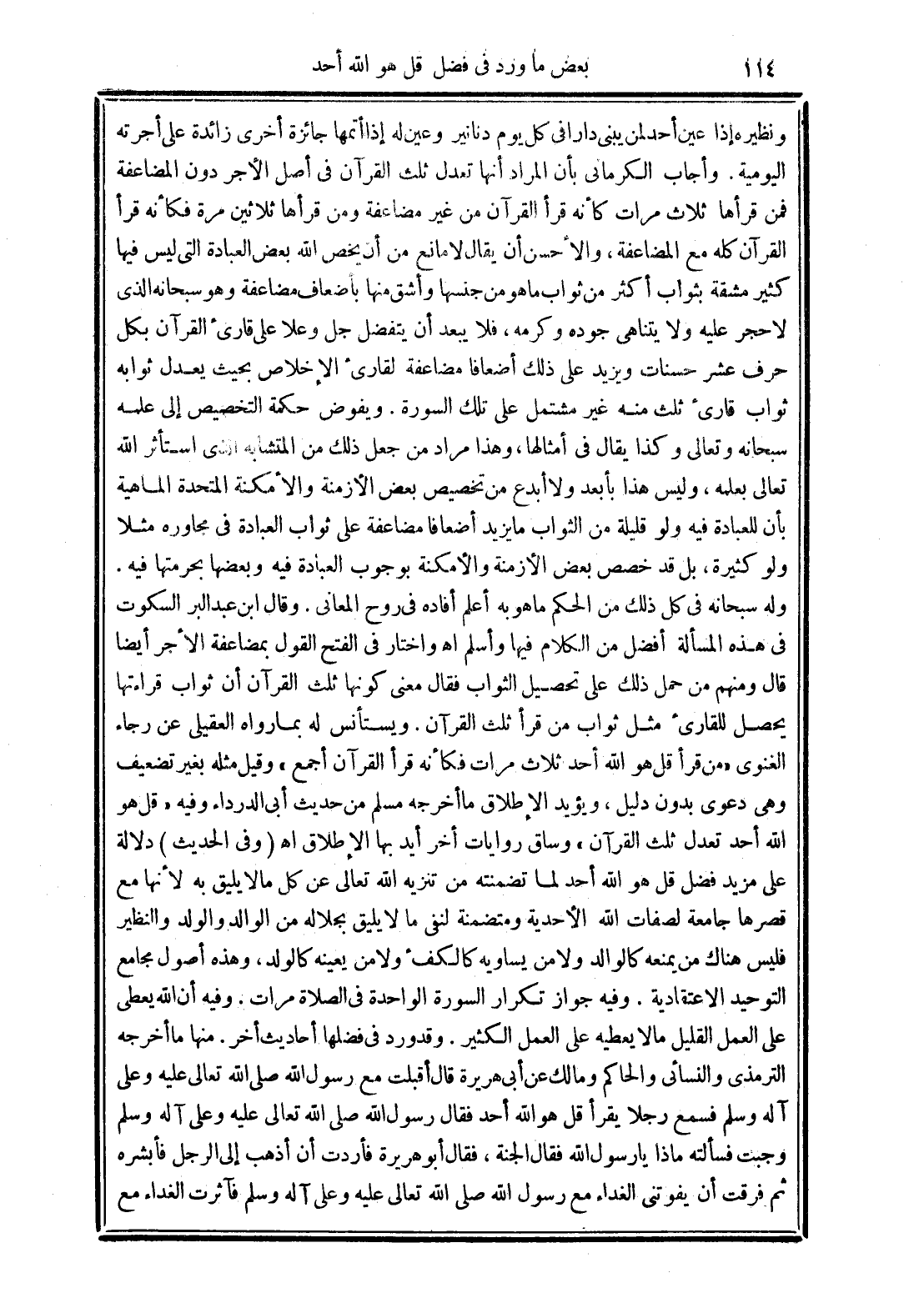 ونظيره إذا عين أحد لمن يبني دار في كل يوم دنانير وعين له إذا أتمها جائزة أخرى زائده على أجرته اليومية وأجاب الكرماني بأن المراد أنها تعدل ثلث القرآن في أصل الأجر دون المضاعفة فمن قرأها ثلاث مرات كأنه قرأ من القرآن من غير مضاعفة ومن قرأها ثلاثين مرة فكأنه قرأ القرآن كله مع المضاعفة والأحسن أن يقال لا مانع من أن يخص الله بعض العبادة التي ليس فيها كثير مشقة بثواب أكثر ما هو من جنسها وأشق منها بأضعاف مضاعفة وهو سبحانه الذي لا حجر عليه ولا يتناهى جوده وكرمه فلا يبعد أن يتفضل جل وعلا على قارئ القرآن بكل حرف عشر حسنات ويزيد على ذلك أضعافًا مضاعفة لقارئ الإخلاص بحيث يعدل ثوابه ثواب قارئ ثلث منه غير مشتمل على تلك السورة ويفوض حكمه التخصص إلى علمه سبحانه وتعالى وكذا يقال في أمثالها وهذا مراد من جعل ذلك من المتشابه الذي استأثر الله تعالى بعلمه وليس هذا بأبعد ولا أبدع من تخصيص بعض الأزمنة والأمكنة المتحدة الماهية بأن للعبادة فيه ولو قليلة من الثواب ما يزيد أضعافًا مضاعفة على ثواب العبادة في مجاوره مثلًا ولو كثيره بل قد خصص الأزمنة والأمكنة بوجوب العبادة فيه وبعضها بحرمتها فيه. وله سبحانه وتعالى في كل ذلك من الحكم ما هو به أعلم أفاده في روح المعاني وقال ابن عبد البر السكوت في هذه المسأله أفضل من الكلام فيها وأسلم واختار في الفتح القول بمضاعفه الأجر أيضًا قال ومنهم من حمل ذلك على تحصيل الثواب فقال معنى كونها ثلث القرآن أن ثواب قراءتها يحصل للقارئ مثل ثواب من قرأ ثلث القرآن ويستأنس له بما رواه العقل عن رجاء الغنوي "من قرأ قل هو الله أحد ثلاث مرات فكأنه قرأ القرآن أجمع" وقيل مثله بغير تضعيف وهي دعوى بدون دليل ويؤيد الإطلاق ما أخرجه مسلم من حديث أبي الدرداء وفيه "قل هو الله تعدل ثلث القرآن" وساق روايات أخر أيد بها الإطلاق اهـ