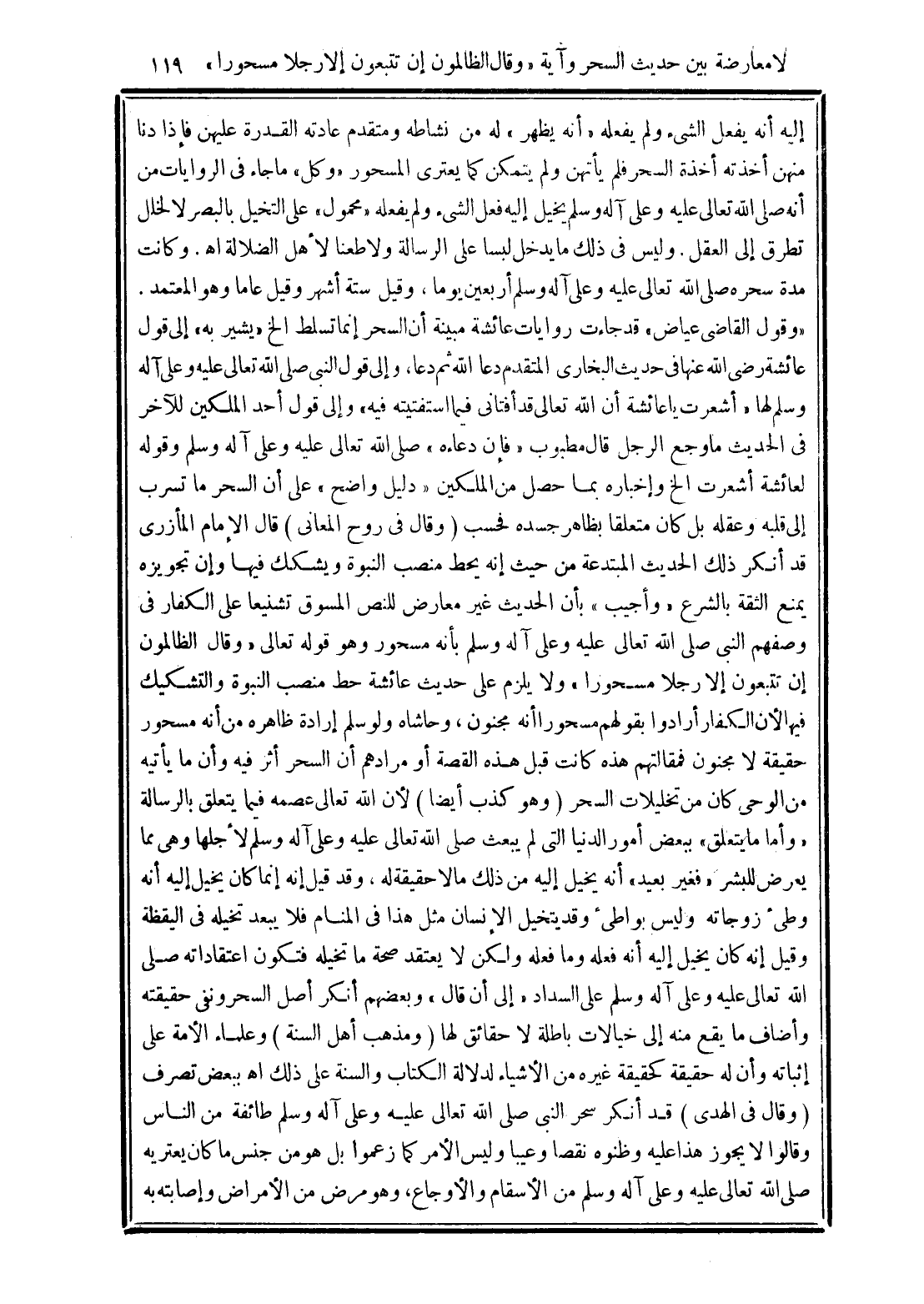 (وقال في روح المعاني) قال الإمام المأزري قد أنكر ذلك الحديث المبتدعه من حيث أنه يحط منصب النبوة ويشكك فيها وإن تجويزه يمنع الثقه بالشرع "واجيب" بأن الحديث غير معارض للنص المسوق تشنيعًا على الكفار في وصفهم النبي صلى الله تعالى عليه وعلى آله وسلم بأنه مسحور وهو قوله تعالى (وَقَالَ الظَّالِمُونَ إِنْ تَتَّبِعُونَ إِلَّا رَجُلًا مَسْحُورًا) ولا يلزم على حديث عائشه حط منصب النبوة والتشكيك فيها لأن الكفار أرادوا بقولهم مسحورًا أنه مجنون, وحاشاه ولو سلم إراده ظاهره من أنه مسحور حقيقة لا مجنون فمقالتهم هذه كانت قبل هذه القصه أو مرادهم أن السحر أثر فيه وأن ما يأتيه من الوحي كان من تخليلات السحر (وهو كذب أيضًا) لأن الله تعالى عصمه فيما يتعلق بالرساله "وأما ما يتعلق" ببعض أمور الدنيا التي لم يبعث صلى الله تعالى عليه وعلى آله وسلم لاجلها وهي مما يعرض للبشر "فغير بعيد" أنه يخيل إليه من ذلك مالا حقيقة له, وقد قيل أنه إنما كان يخيل إليه أنه وطئ زوجاته وليس بواطئ وقد يتخيل الإنسان مثل هذا في المنام فلا يبعد تخيله في اليقظه وقيل أنه كان يخيل إليه أنه فعله وما فعله ولكن لا يعتقد صحه ما تخيله فتكون اعتقاداته صلى الله تعالى عليه وعلى آله وسلم على السداد "إلى أن قال" وبعضهم أنكر أصل السحر ونفى حقيقته وأضاف ما يقع منه إلى خيالات باطله لا حقائق لها