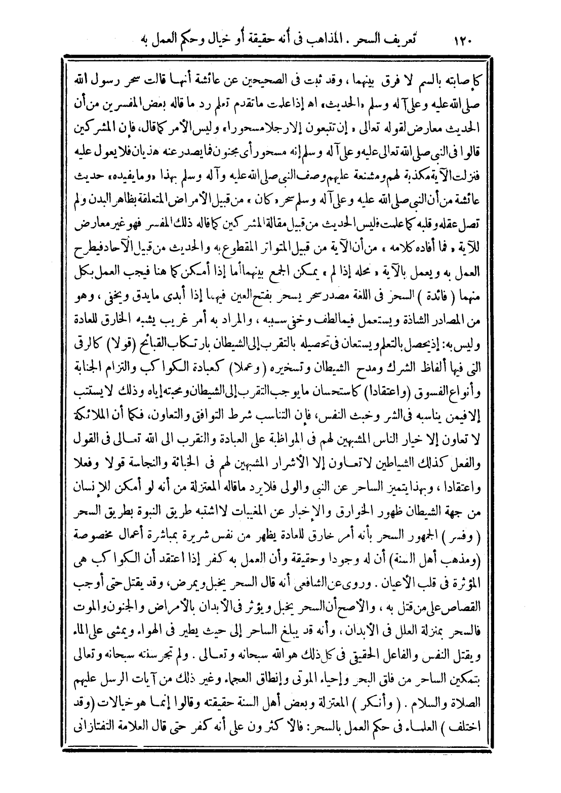 (ومذهب أهل السنة) أن له وجودًا وحقيقة وأن العمل به كفر إذا اعتقد أن الكواكب هي المؤثرة في قلب الأعيان. وروي عن الشافعي أن قال السحر يخبل ويمرض , وقد يقتل حتى أوجب القصاص على من قتل به, والأصح أن السحر يخبل ويؤثر في الأبدان بالأمراض والجنون والموت فالسحر بمنزله العلل في الأبدان, وأنه قد يبلغ الساحر إلى حيث يطير في الهواء ويمشي على الماء ويقتل النفس والفاعل الحقيقي في كل ذلك هو الله سبحانه وتعالى بتمكين الساحر من فلق البحر وإحياء الموتى وإنطاق العجماء وغير ذلك من آيات الرسل عليهم الصلاة والسلام.