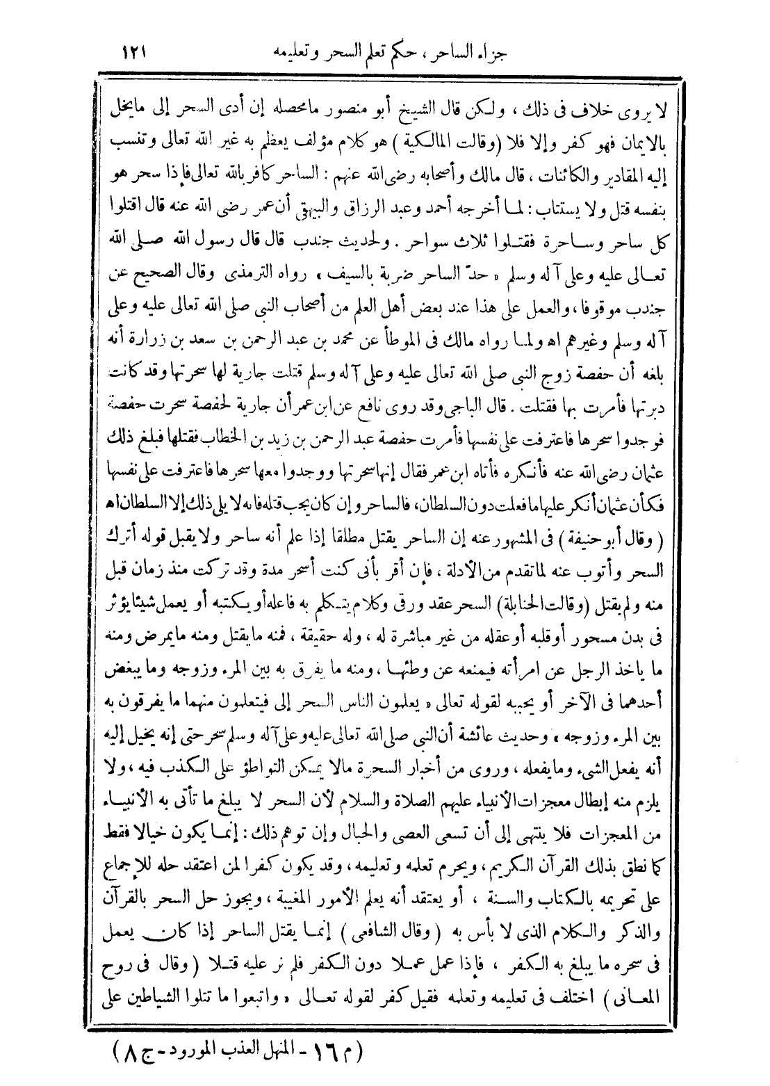 (وقالت المالكية) هو كلام مؤلف يعظم به غير الله تعالى وتنسب إليه المقادير والكائنات , قال مالك وأصحابه رضي الله عنهم: الساحر كافر بالله تعالى فإذا سحر هو بنفسه قتل ولا يستتاب: لما أخرجه أحمد وعبد الرازق والبيهقي أن عمر رضي الله عنه قال اقتلوا كل ساحر وساحرة فقتلوا ثلاث سواحر. ولحديث جندب قال قال رسول الله صلى الله تعالى عليه وعلى آله وسلم "حد الساحر ضربه بالسيف "رواه الترمذي وقال الصحيح عن جندب موقوفًا, والعمل على هذا عند بعض أهل العلم من أصحاب النبي صلى الله تعالى عليه وعلى اله وسلم وغيرهم ولما رواه مالك في الموطأ عن محمَّد بن عبد الرحمن بن سعد بن زرارة أنه بلغه أن حفصة زوج النبي صلى الله تعالى عليه وعلى آله وسلم قتلت جاريه لها سحرتها وقد كانت دبرتها فأمرت بها فقتلت. قال الباجي وقد روى نافع عن ابن عمر أن جارية لحفصة سحرت حفصة فوجدوا سحرها فاعترفت على نفسها فأمرت حفصة عبد الرحمن بن زيد بن الخطاب فقتلها فبلغ ذلك عثمان رضي الله عنه فأنكره فأتاه بن عمر فقال أنها سحرتها ووجدوا معها سحرها فاعترفت على نفسها فكأن عثمان أنكر عليها ما فعلت دون السلطان, فالساحر وإن كان يجب قتله فإنه لا يلي ذلك إلا السلطان