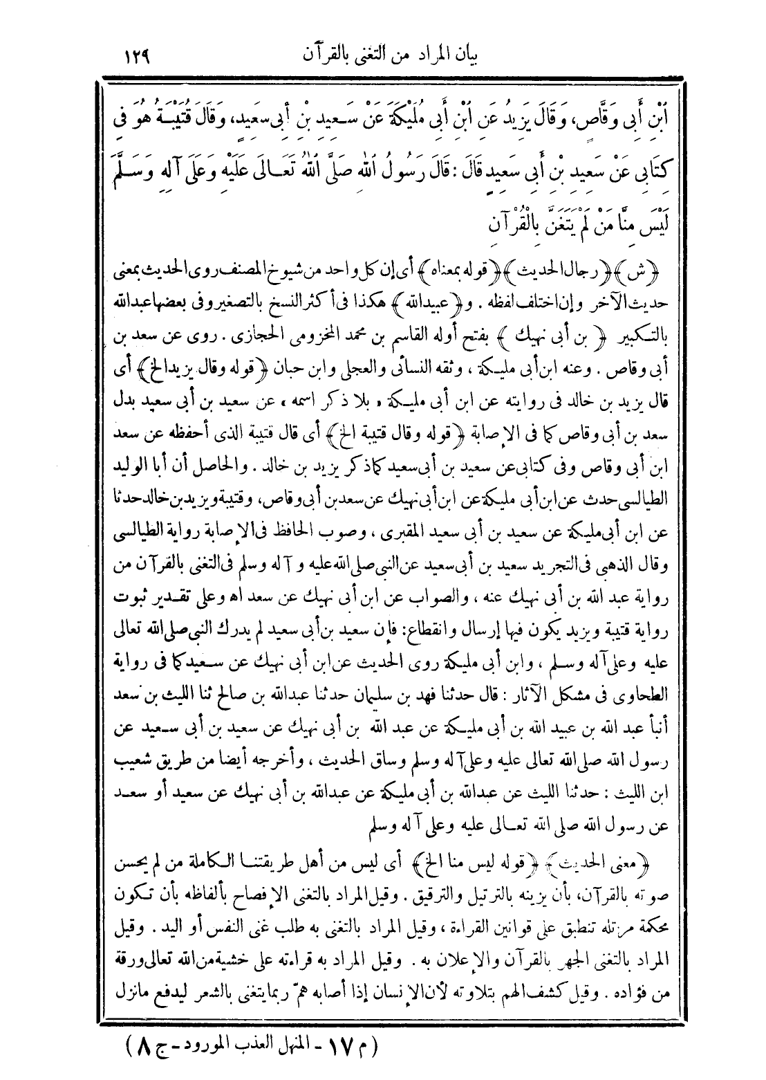 بْنِ أَبِي وَقَّاصٍ -وَقَالَ يَزِيدُ عَنِ ابْنِ أَبِي مُلَيْكَةَ- عَنْ سَعِيدِ بْنِ أَبِي سَعِيدٍ وَقَالَ قُتَيْبَةُ هُوَ فِي كِتَابِي عَنْ سَعِيدِ بْنِ أَبِي سَعِيدٍ قَالَ: قَالَ رَسُولُ اللَّهِ -صَلَّى الله تَعَالَى عَلَيْهِ وَعَلَى آلِهِ وَسَلَّمَ- "لَيْسَ مِنَّا مَنْ لَمْ يَتَغَنَّ بِالْقُرْآنِ".