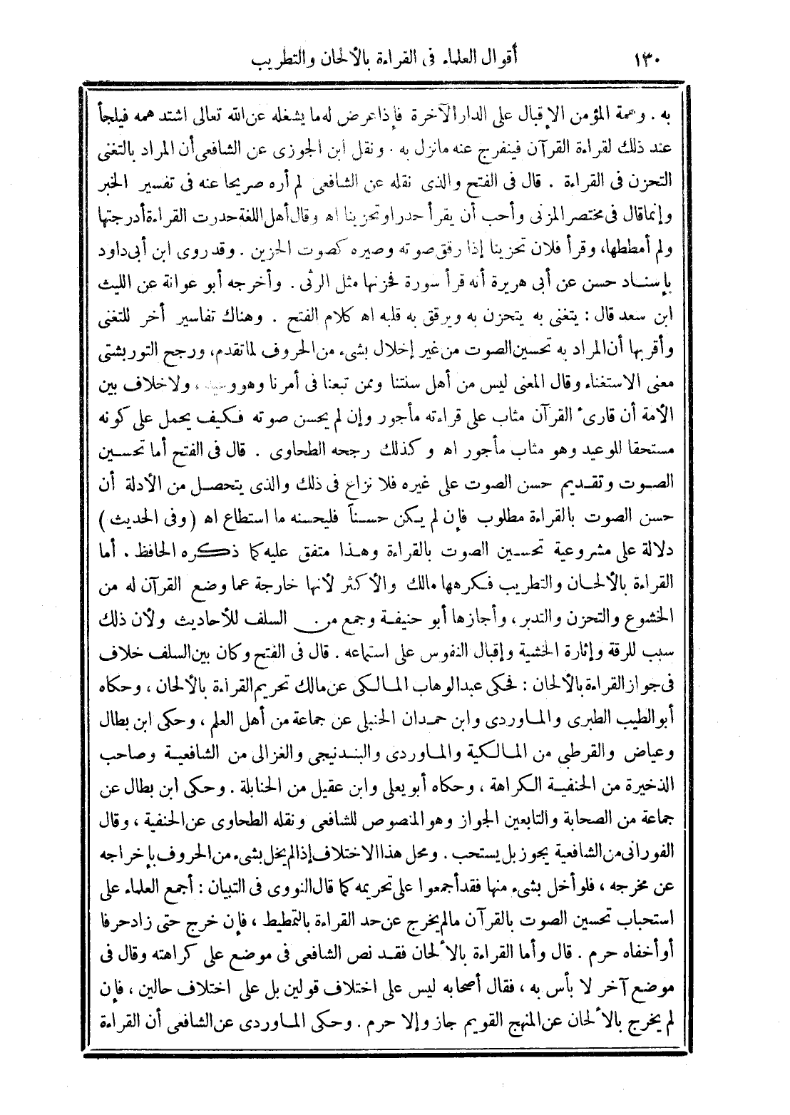 وقال أهل اللغة حدرت القراءة أدرجتها ولم أمططها، وقرأ فلان تحزينًا إذا رقق صوته وصيره كصوت الحزين. وقد روى ابن أبي داود بإسناد حسن عن أبي هريرة أنه قرأ سورة فحزنها مثل الرثى. وأخرجه أبو عوانه عن الليث ابن سعد قال: يتغنى به يتحزن به ويرقق به قلبه اهـ كلام الفتح.