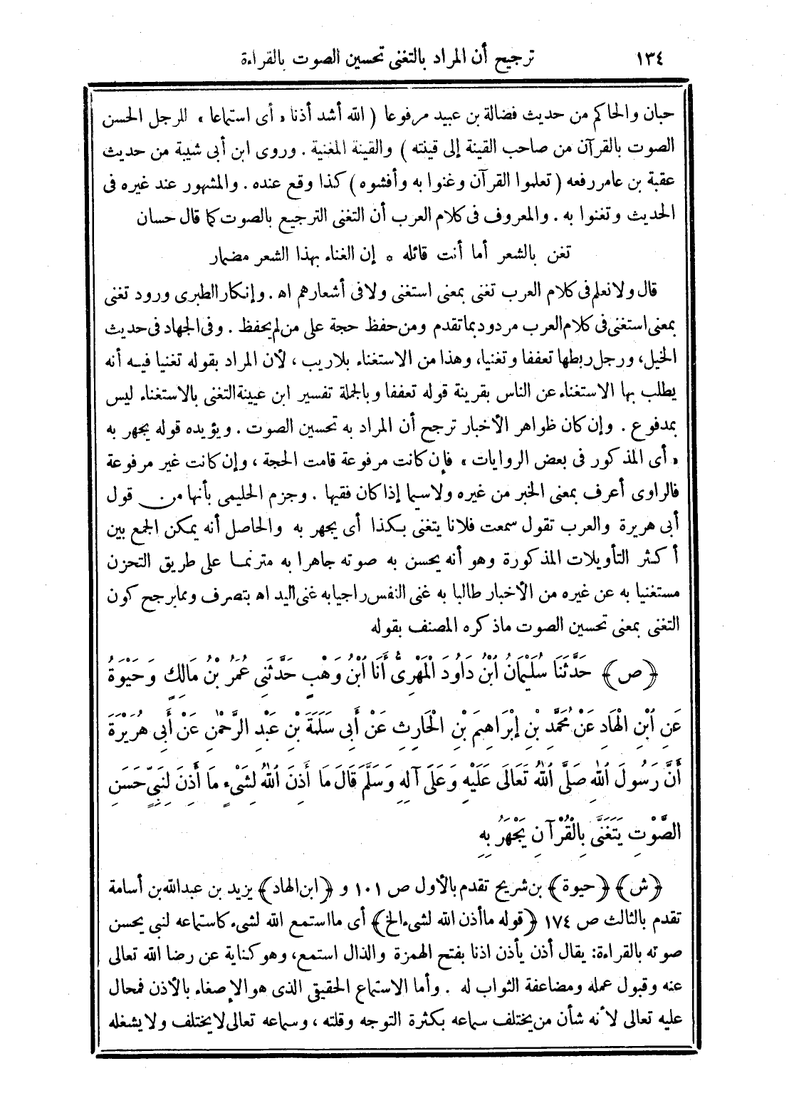 حبان والحاكم من حديث فضالة بن عبيد مرفوعًا (الله اشتد أذنا "أي استماعا" للرجل الحسن الصوت بالقران من صاحب القينه إلى قينته) والقينه المغنية. وروى ابن أبي شيبة من حديث عقبة بن عامر رفعه (تعلموا القرآن وغنوا به وأفشوه) كذا وقع عنده. والمشهور عند غيره في الحديث وتغنوا به. والمعروف في كلام العرب أن التغني الترجيح. بالصوت كما قال حسان