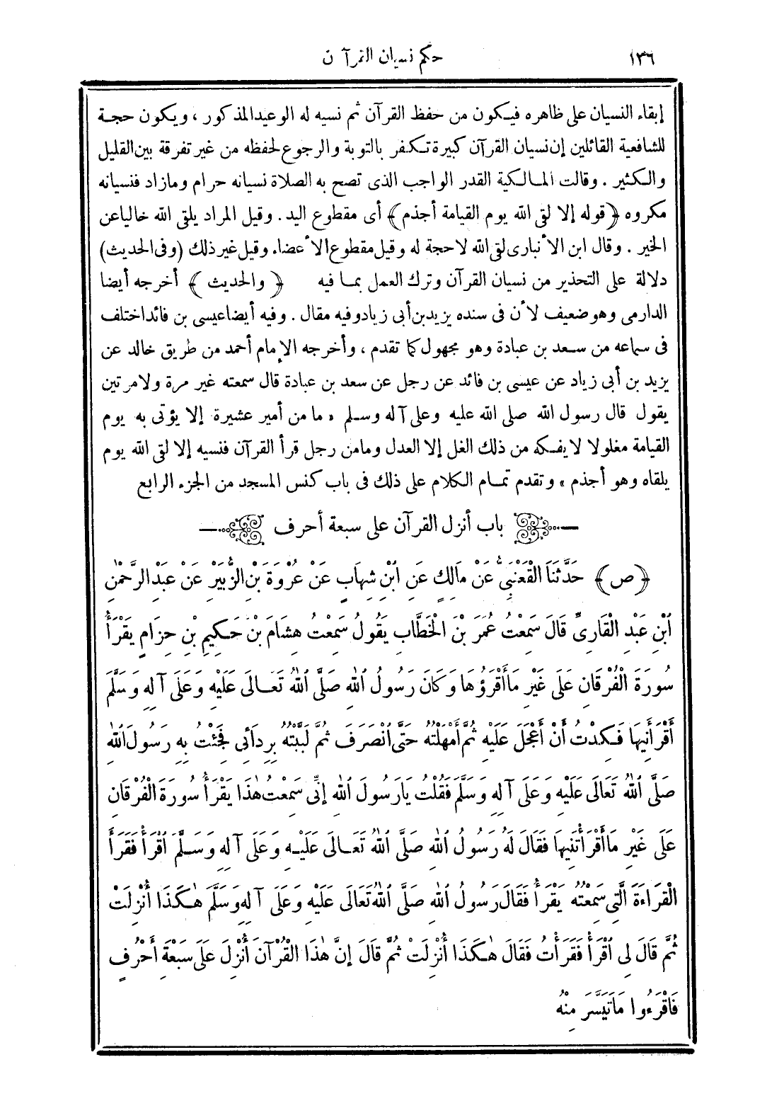 إبقاء النسيان على ظاهره من حفظ القرآن ثم نسيه له الوعيد المذكور, ويكون حجه للشافعيه القائلين إن نسيان القرآن كبيرة تكفر بالتوبة والرجوع لحفظه من عير تفرقة بين القليل والكثير وقالت المالكية القدر الواجب الذي تصح به الصلاة نسيانه حرام وما زاد فنسيانه مكروه