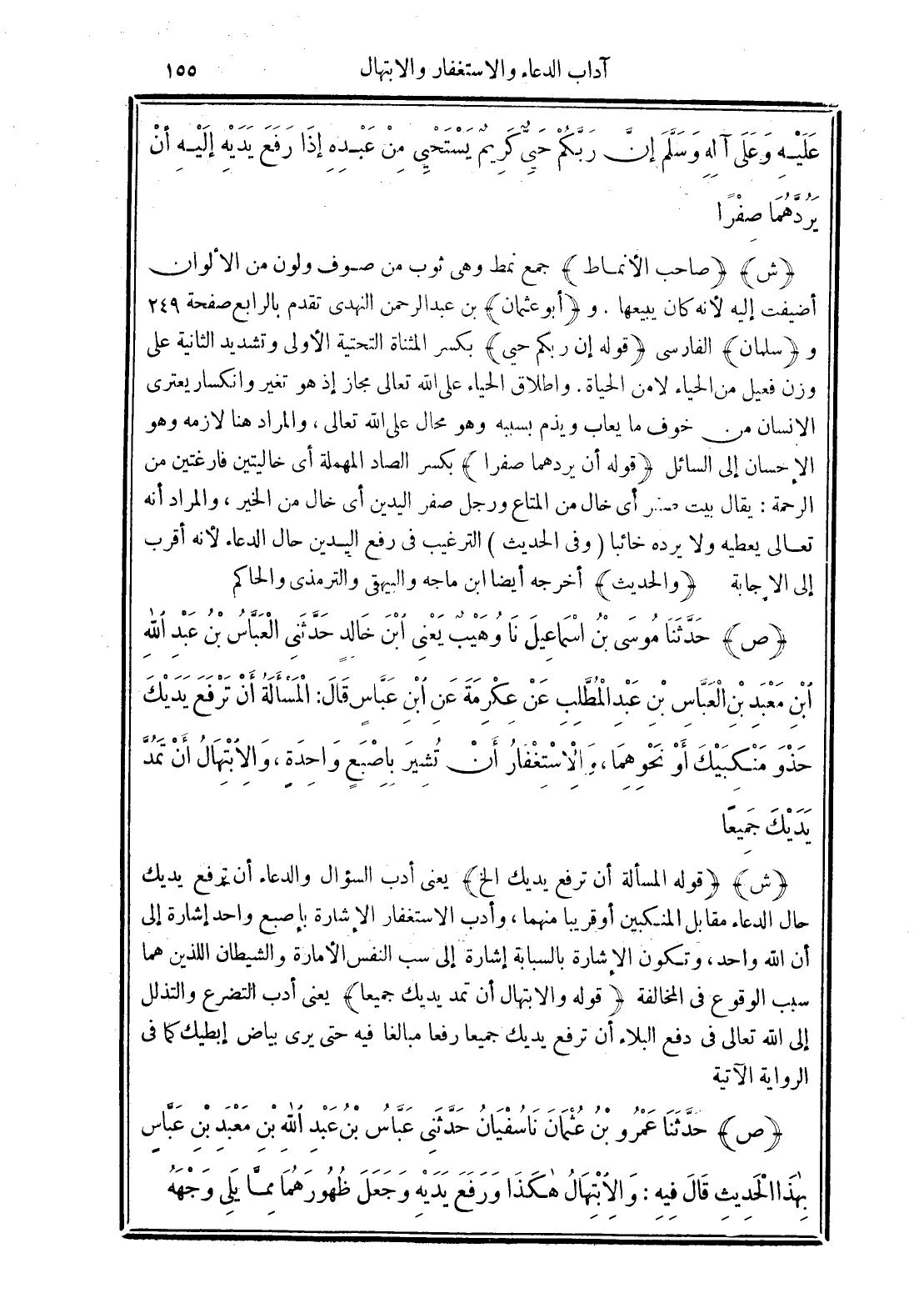(ص) حَدَّثَنَا مُوسَى بْنُ إِسْمَاعِيلَ نَا وُهَيْبٌ -يَعْنِي ابْنَ خَالِدٍ- حَدَّثَنِي الْعَبَّاسُ بْنُ عَبْدِ اللَّهِ بْنِ مَعْبَدِ بْنِ الْعَبَّاسِ بْنِ عَبْدِ الْمُطَّلِبِ عَنْ عِكْرِمَةَ عَنِ ابْنِ عَبَّاسٍ قَالَ الْمَسْأَلَةُ أَنْ تَرْفَعَ يَدَيْكَ حَذْوَ مَنْكِبَيْكَ أَوْ نَحْوَهُمَا وَالاِسْتِغْفَارُ أَنْ تُشِيرَ بِأُصْبُعٍ وَاحِدَةٍ وَالاِبْتِهَالُ أَنْ تَمُدَّ يَدَيْكَ جَمِيعًا.