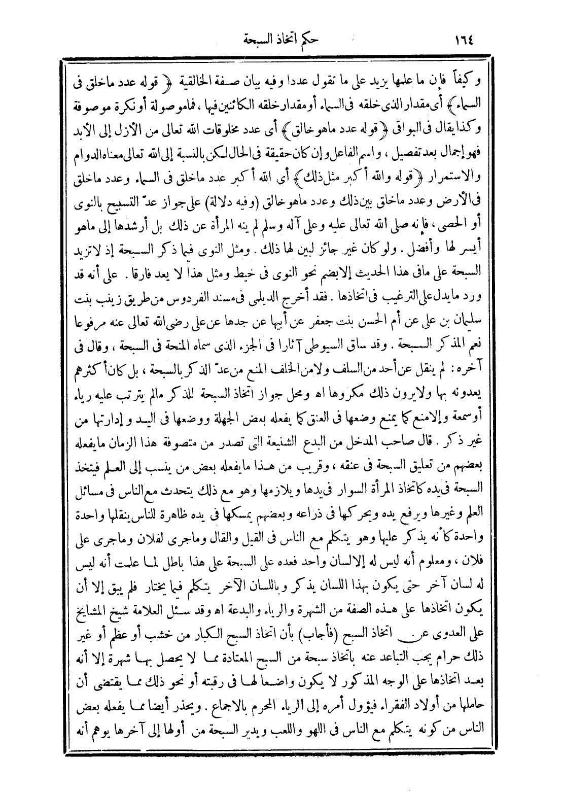 وقد سئل العلامه شيخ المشايخ على العدوي عن اتخاذ السبح (فأجاب) بأن اتخاذ السبح الكبار من خشب أو عظم أو غير ذلك حرام يجب التباعد عنه باتخاذ سبحة من السبح المعتادة مما لا يحصل بها شهرة إلا أنه بعد اتخاذها على الوجه المذكور لا يكون واضعًا لها في رقبته أو نحو ذلك مما يقتضي أن حاملها من أولاد الفقراء فيؤول أمره إلى الرياء المحرم بالاجماع ويحذر أيضًا مما يفعله بعض الناس من كونه يتكلم مع الناس في اللهو واللعب ويدير السبحة من أولها إلى آخرها يوهم أنه