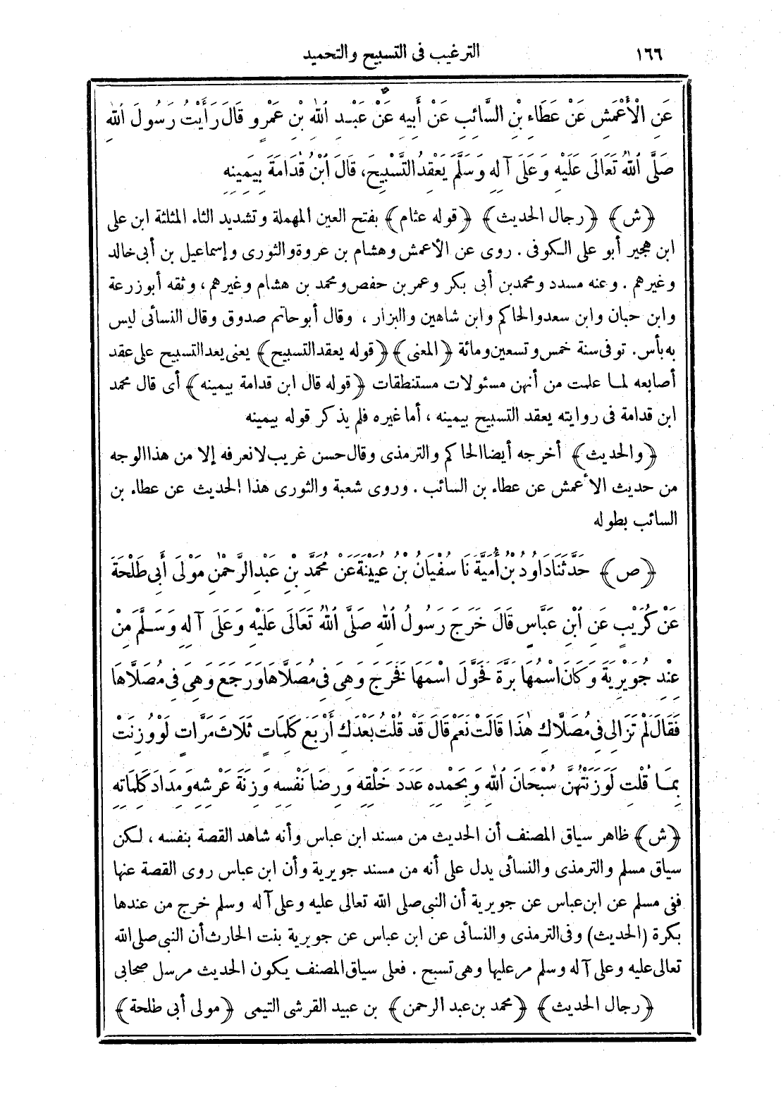 عَنِ الأَعْمَشِ عَنْ عَطَاءِ بْنِ السَّائِبِ عَنْ أَبِيهِ عَنْ عَبْدِ اللَّهِ بْنِ عَمْرٍو قَالَ رَأَيْتُ رَسُولَ اللَّهِ -صَلَّى الله تَعَالَى عَلَيْهِ وَعَلَى آلِهِ وَسَلَّمَ-يَعْقِدُ التَّسْبِيحَ قَالَ ابْنُ قُدَامَةَ- بِيَمِينِهِ.