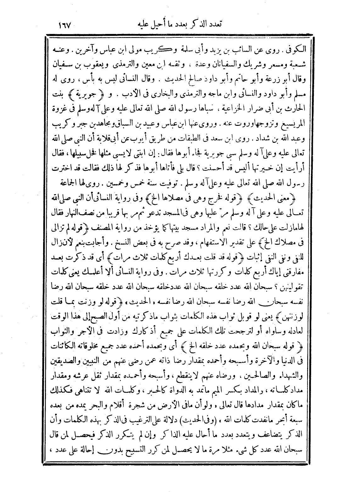 (قوله سبحان الله وبحمده عدد خلقه الخ) أي وبحمده أحمده عدد جميع مخلوقاته الكائنات في الدنيا والآخرة وأسبحه وأحمده بمقدار رضا ذاته عمن رضي عنهم من النبيين والصدقيين والشهداء والصالحين, ورضاه عنهم لا ينقطع وأسبحه وأحمده بمقدار ثقل عرشه ومقدار مداد كلماته, والمداد بكسر الميم ما تمد به الدواة كالحبر, وكلمات الله لا تتناهى فكذلك ما كان بمقدار مدادها قال تعالى "ولو أن ما في الأرض من شجرة أقلام والبحر يمده من بعده سبعة أبحر ما نفذت كلمات الله"