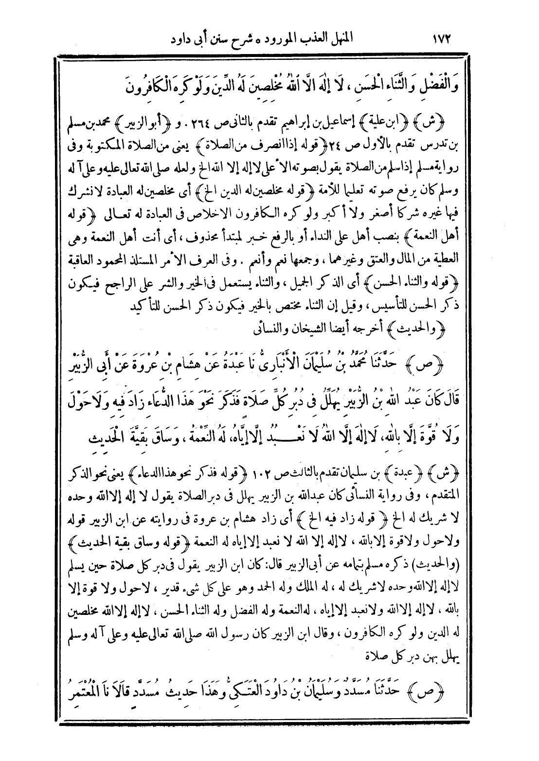 (ص) حَدَّثَنَا مُحَمَّدُ بْنُ سُلَيْمَانَ الأَنْبَارِيُّ نَا عَبْدَةُ عَنْ هِشَامِ بْنِ عُرْوَةَ عَنْ أَبِي الزُّبَيْرِ قَالَ كَانَ عَبْدُ اللَّهِ بْنُ الزُّبَيْرِ يُهَلِّلُ فِي دُبُرِ كُلِّ صَلاَةٍ فَذَكَرَ نَحْوَ هَذَا الدُّعَاءِ زَادَ فِيهِ "وَلاَ حَوْلَ وَلاَ قُوَّةَ إِلاَّ بِاللَّهِ لاَ إِلَهَ إِلاَّ اللَّهُ لاَ نَعْبُدُ إِلاَّ إِيَّاهُ لَهُ النِّعْمَةُ". وَسَاقَ بَقِيَّةَ الْحَدِيثِ.