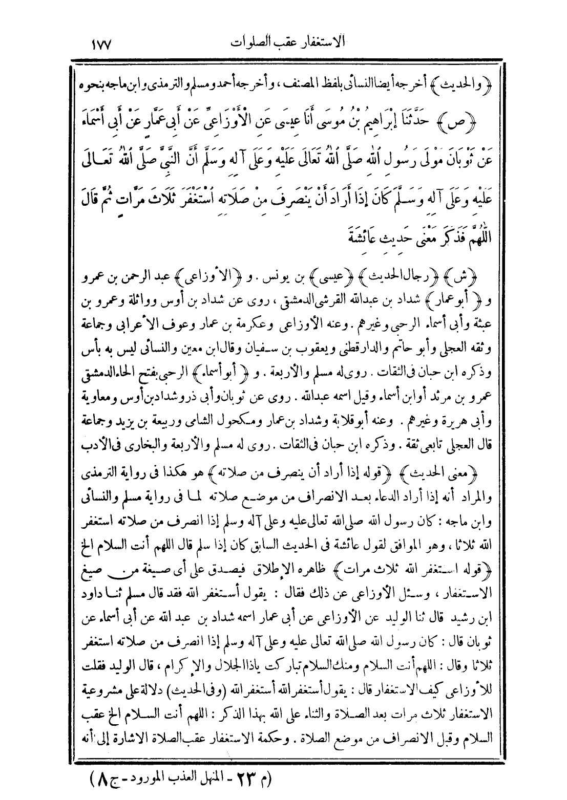 (ص) حَدَّثَنَا إِبْرَاهِيمُ بْنُ مُوسَى أَنَا عِيسَى عَنِ الأَوْزَاعِيِّ عَنْ أَبِي عَمَّارٍ عَنْ أَبِي أَسْمَاءَ عَنْ ثَوْبَانَ مَوْلَى رَسُولِ اللَّهِ -صَلَّى الله تَعَالَى عَلَيْهِ وَعَلَى آلِهِ وَسَلَّمَ- أَنَّ النَّبِيَّ -صَلَّى الله تَعَالَى عَلَيْهِ وَعَلَى آلِهِ وَسَلَّمَ- كَانَ إِذَا أَرَادَ أَنْ يَنْصَرِفَ مِنْ صَلاَتِهِ اسْتَغْفَرَ ثَلاَثَ مَرَّاتٍ ثُمَّ قَالَ "اللَّهُمَّ". فَذَكَرَ مَعْنَى حَدِيثِ عَائِشَةَ رضي الله عنها.