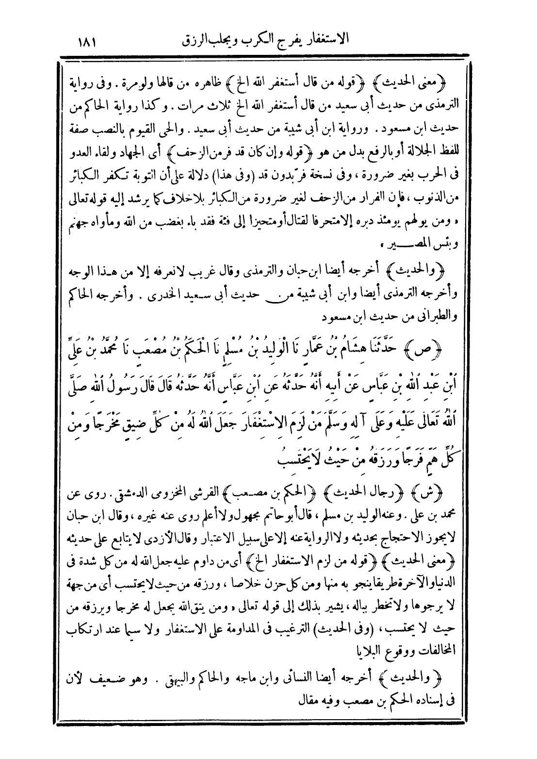 (ص) حَدَّثَنَا هِشَامُ بْنُ عَمَّارٍ نَا الْوَلِيدُ بْنُ مُسْلِمٍ نَا الْحَكَمُ بْنُ مُصْعَبٍ نَا مُحَمَّدُ بْنُ عَلِيِّ بْنِ عَبْدِ اللَّهِ بْنِ عَبَّاسٍ عَنْ أَبِيهِ أَنَّهُ حَدَّثَهُ عَنِ ابْنِ عَبَّاسٍ أَنَّهُ حَدَّثَهُ قَالَ قَالَ رَسُولُ اللَّهِ -صَلَّى الله تَعَالَى عَلَيْهِ وَعَلَى آلِهِ وَسَلَّمَ- "مَنْ لَزِمَ الاِسْتِغْفَارَ جَعَلَ اللَّهُ لَهُ مِنْ كُلِّ ضِيقٍ مَخْرَجًا وَمِنْ كُلِّ هَمٍّ فَرَجًا وَرَزَقَهُ مِنْ حَيْثُ لاَ يَحْتَسِبُ".