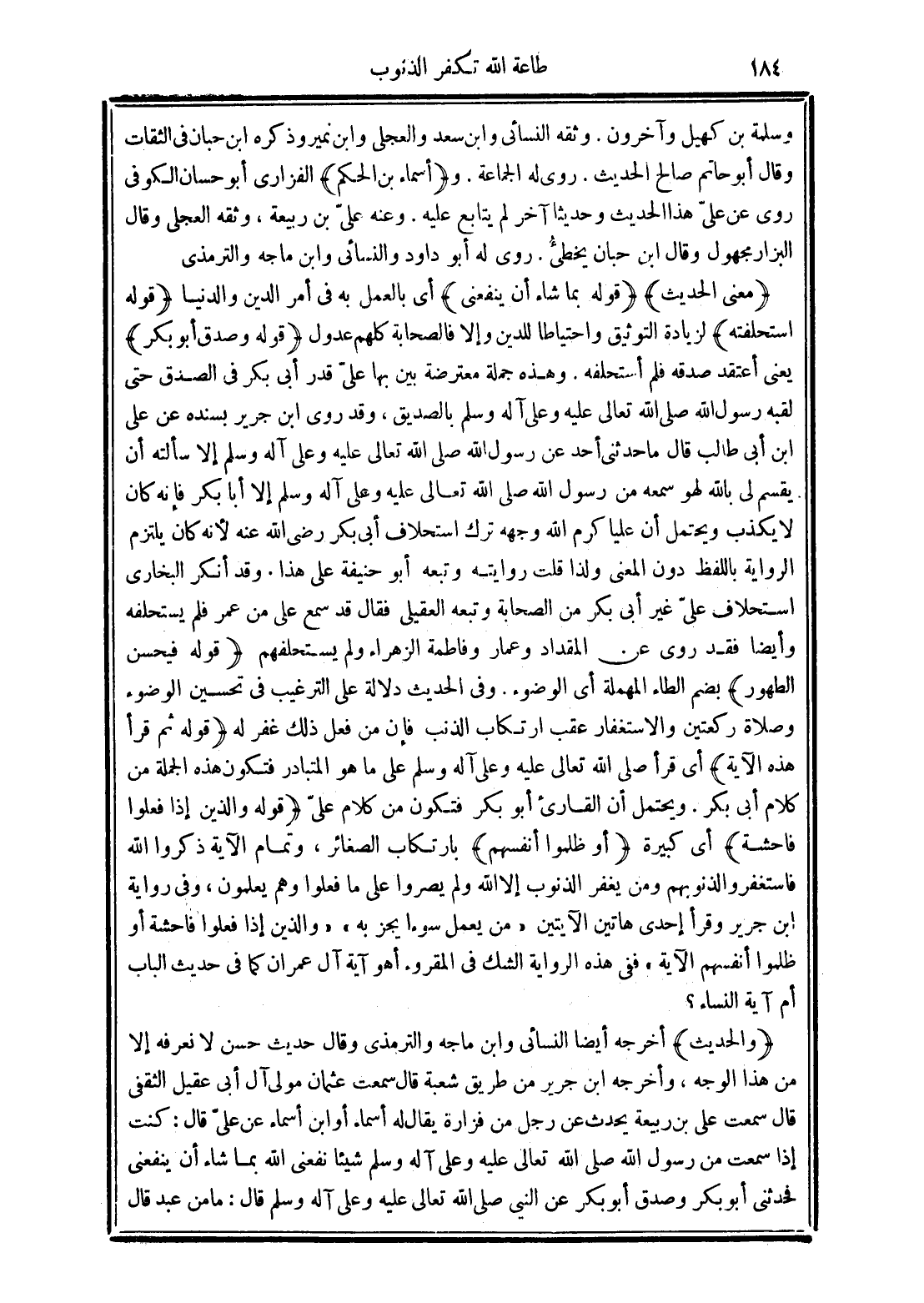 (والحديث) أخرجه أيضًا النسائي وابن ماجه والترمذي وقال حديث حسن لا نعرفه إلا من هذا الوجه وأخرجه ابن جرير من طريق شعبة قال سمعت عثمان مولى آل أبي عقيل الثقفي قال سمعت علي بن ربيعة يحدث عن رجل من فزارة يقال له أسماء أو ابن أسماء عن عليّ قال: كنت إذا سمعت من رسول الله صلى الله تعالى عليه وعلى آله وسلم شيئًا نفعنى الله بما شاء أن ينفعني فحدثنى أبو بكر وصدق أبو بكر عن النبي صلى الله تعالى عليه وعلى آله وسلم قال: ما من عبد قال