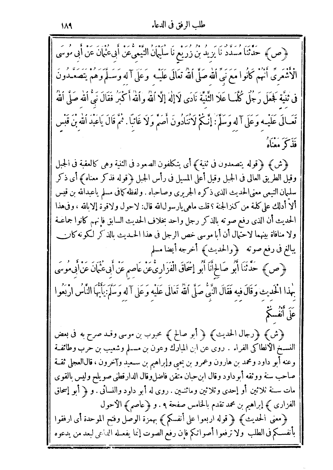 (ص) حَدَّثَنَا أَبُو صَالِحٍ أَنَا أَبُو إِسْحَاقَ الْفَزَارِيُّ عَنْ عَاصِمٍ عَنْ أَبِي عُثْمَانَ عَنْ أَبِي مُوسَى بِهَذَا الْحَدِيثِ وَقَالَ فِيهِ فَقَالَ النَّبِيُّ -صَلَّى الله تَعَالَى عَلَيْهِ وَعَلَى آلِهِ وَسَلَّمَ- "يَا أَيُّهَا النَّاسُ أرْبَعُوا عَلَى أَنْفُسِكُمْ".