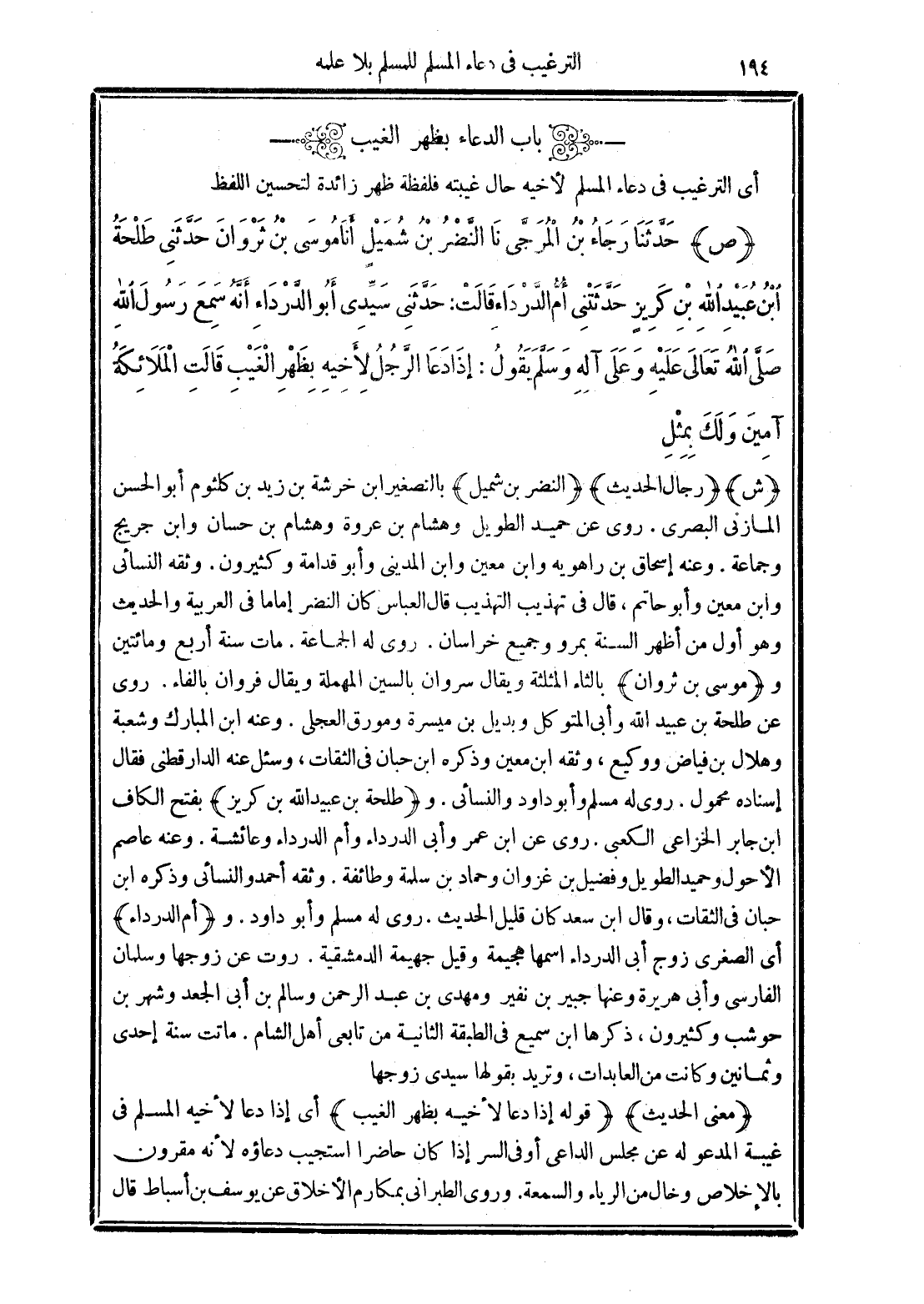 (ص) حَدَّثَنَا رَجَاءُ بْنُ الْمُرَجَّى نَا النَّضْرُ بْنُ شُمَيْلٍ أَنَا مُوسَى بْنُ ثَرْوَانَ حَدَّثَنِي طَلْحَةُ بْنُ عُبَيْدِ اللَّهِ بْنِ كَرِيزٍ حَدَّثَتْنِي أُمُّ الدَّرْدَاءِ قَالَتْ حَدَّثَنِي سَيِّدِي أَبُو الدَّرْدَاءِ أَنَّهُ سَمِعَ رَسُولَ اللَّهِ -صَلَّى الله تَعَالَى عَلَيْهِ وَعَلَى آلِهِ وَسَلَّمَ- يَقُولُ "إِذَا دَعَا الرَّجُلُ لأَخِيهِ بِظَهْرِ الْغَيْبِ قَالَتِ الْمَلاَئِكَةُ آمِينَ وَلَكَ بِمِثْلٍ".