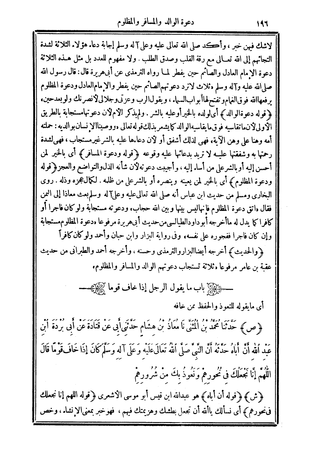 (ص) حَدَّثَنَا مُحَمَّدُ بْنُ الْمُثَنَّى نَا مُعَاذُ بْنُ هِشَامٍ حَدَّثَنِي أَبِي عَنْ قَتَادَةَ عَنْ أَبِي بُرْدَةَ بْنِ عَبْدِ اللَّهِ أَنَّ أَبَاهُ حَدَّثَهُ أَنَّ النَّبِيَّ -صَلَّى الله تَعَالَى عَلَيْهِ وَعَلَى آلِهِ وَسَلَّمَ- كَانَ إِذَا خَافَ قَوْمًا قَالَ "اللَّهُمَّ إِنَّا نَجْعَلُكَ فِي نُحُورِهِمْ وَنَعُوذُ بِكَ مِنْ شُرُورِهِمْ".
