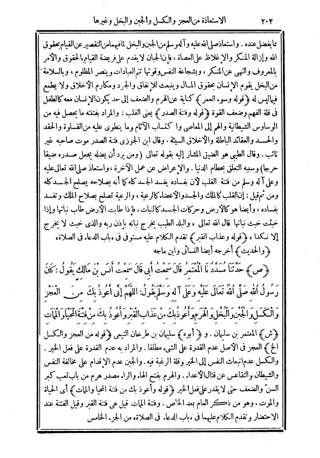 (ص) حَدَّثَنَا مُسَدَّدٌ نَا الْمُعْتَمِرُ قَالَ سَمِعْتُ أَبِي قَالَ سَمِعْتُ أَنَسَ بْنَ مَالِكٍ يَقُولُ كَانَ رَسُولُ اللَّهِ -صَلَّى الله تَعَالَى عَلَيْهِ وَعَلَى آلِهِ وَسَلَّمَ- يَقُولُ "اللَّهُمَّ إِنِّي أَعُوذُ بِكَ مِنَ الْعَجْزِ وَالْكَسَلِ وَالْجُبْنِ وَالْبُخْلِ وَالْهَرَمِ وَأَعُوذُ بِكَ مِنْ عَذَابِ الْقَبْرِ وَأَعُوذُ بِكَ مِنْ فِتْنَةِ الْمَحْيَا وَالْمَمَاتِ".