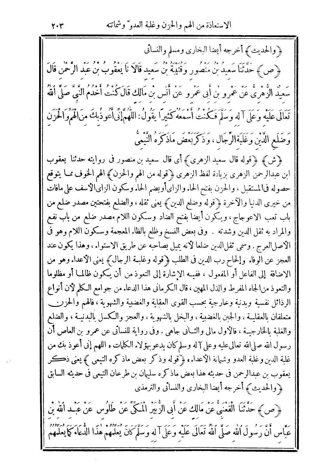 (ص) حَدَّثَنَا سَعِيدُ بْنُ مَنْصُورٍ وَقُتَيْبَةُ بْنُ سَعِيدٍ قَالاَ نَا يَعْقُوبُ بْنُ عَبْدِ الرَّحْمَنِ -قَالَ سَعِيدٌ الزُّهْرِيُّ - عَنْ عَمْرِو بْنِ أَبِي عَمْرٍو عَنْ أَنَسِ بْنِ مَالِكٍ قَالَ كُنْتُ أَخْدُمُ النَّبِيَّ -صَلَّى الله تَعَالَى عَلَيْهِ وَعَلَى آلِهِ وَسَلَّمَ- فَكُنْتُ أَسْمَعُهُ كَثِيرًا يَقُولُ "اللَّهُمَّ إِنِّي أَعُوذُ بِكَ مِنَ الْهَمِّ وَالْحَزَنِ وَضَلْعِ الدَّيْنِ وَغَلَبَةِ الرِّجَالِ". وَذَكَرَ بَعْضَ مَا ذَكَرَهُ التَّيْمِيُّ.