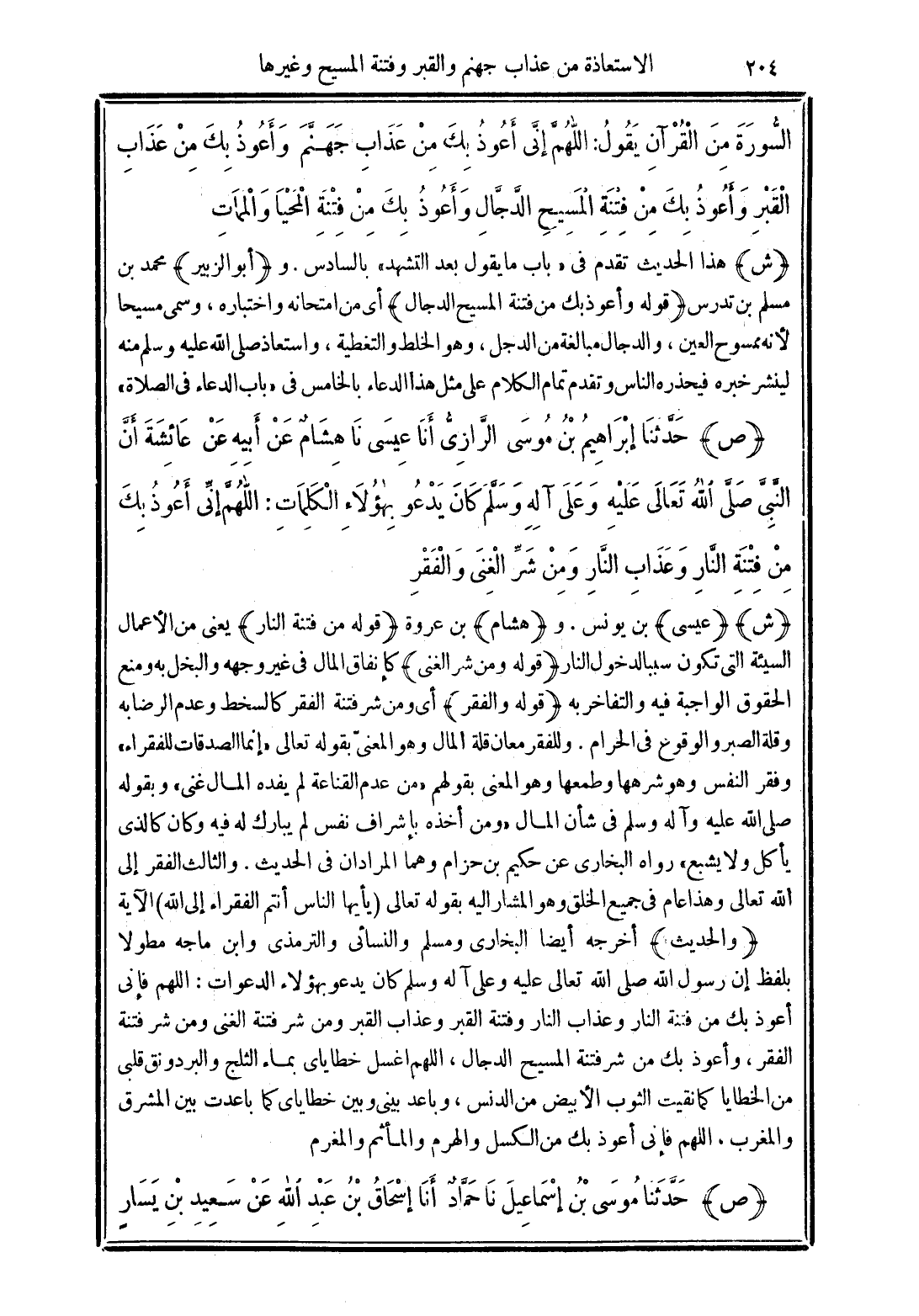 (ص) حَدَّثَنَا إِبْرَاهِيمُ بْنُ مُوسَى الرَّازِيُّ أَنَا عِيسَى نَا هِشَامٌ عَنْ أَبِيهِ عَنْ عَائِشَةَ رضي الله عنها أَنَّ النَّبِيَّ -صَلَّى الله تَعَالَى عَلَيْهِ وَعَلَى آلِهِ وَسَلَّمَ- كَانَ يَدْعُو بِهَؤُلاَءِ الْكَلِمَاتِ "اللَّهُمَّ إِنِّي أَعُوذُ بِكَ مِنْ فِتْنَةِ النَّارِ وَعَذَابِ النَّارِ وَمِنْ شَرِّ الْغِنَى وَالْفَقْرِ".