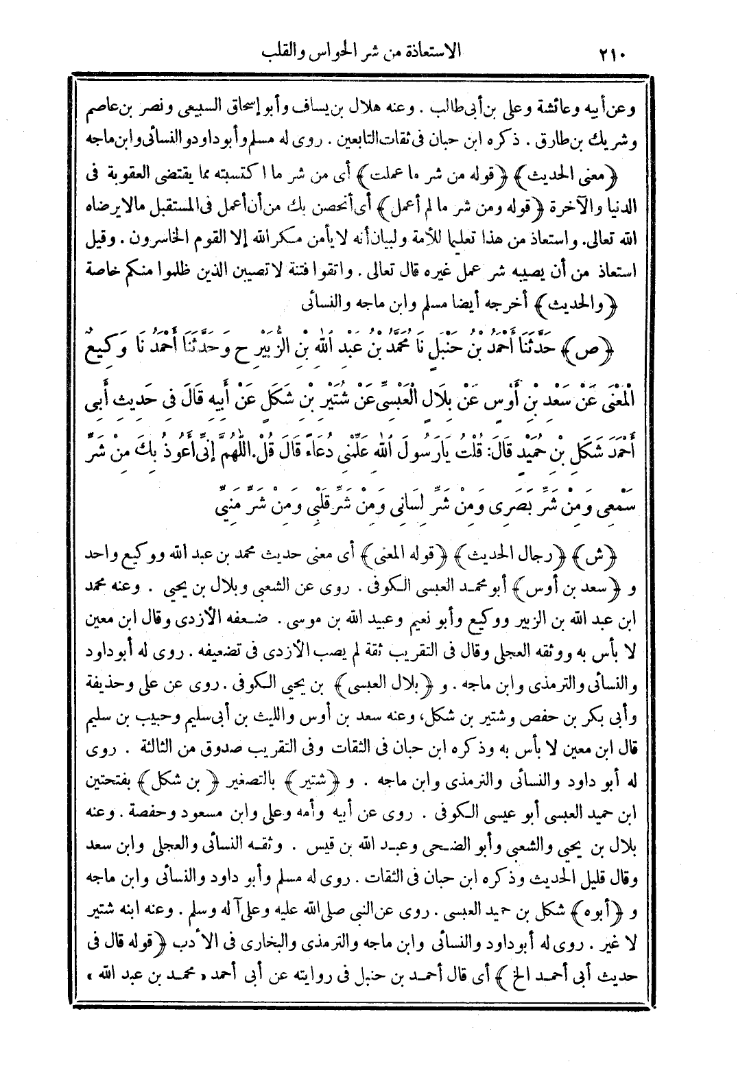 (ص) حَدَّثَنَا أَحْمَدُ بْنِ حَنْبَلٍ نَا مُحَمَّدُ بْنُ عَبْدِ اللَّهِ بْنِ الزُّبَيْرِ ح وَنَا أَحْمَدُ نَا وَكِيعٌ -الْمَعْنَى- عَنْ سَعْدِ بْنِ أَوْسٍ عَنْ بِلاَلٍ الْعَبْسِيِّ عَنْ شُتَيْرِ بْنِ شَكَلٍ عَنْ أَبِيهِ فِي حَدِيثِ أَبِي أَحْمَدَ شَكَلِ بْنِ حُمَيْدٍ - قَالَ- قُلْتُ يَا رَسُولَ اللَّهِ عَلِّمْنِي دُعَاءً قَالَ "قُلِ اللَّهُمَّ إِنِّي أَعُوذُ بِكَ مِنْ شَرِّ سَمْعِي وَمِنْ شَرِّ بَصَرِي وَمِنْ شَرِّ لِسَانِي وَمِنْ شَرِّ قَلْبِي وَمِنْ شَرِّ مَنِيِّي".