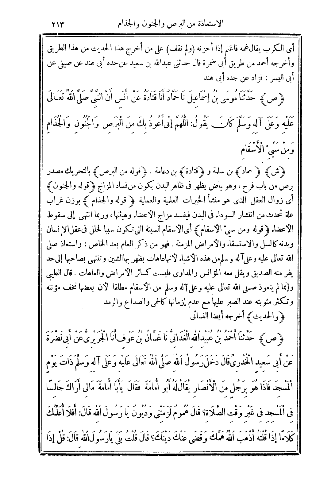 (ص) حَدَّثَنَا مُوسَى بْنُ إِسْمَاعِيلَ نَا حَمَّادٌ أَنَا قَتَادَةُ عَنْ أَنَسٍ أَنَّ النَّبِيَّ -صَلَّى الله تَعَالَى عَلَيْهِ وَعَلَى آلِهِ وَسَلَّمَ- كَانَ يَقُولُ "اللَّهُمَّ إِنِّي أَعُوذُ بِكَ مِنَ الْبَرَصِ وَالْجُنُونِ وَالْجُذَامِ وَمِنْ سَيِّئِ الأَسْقَامِ".