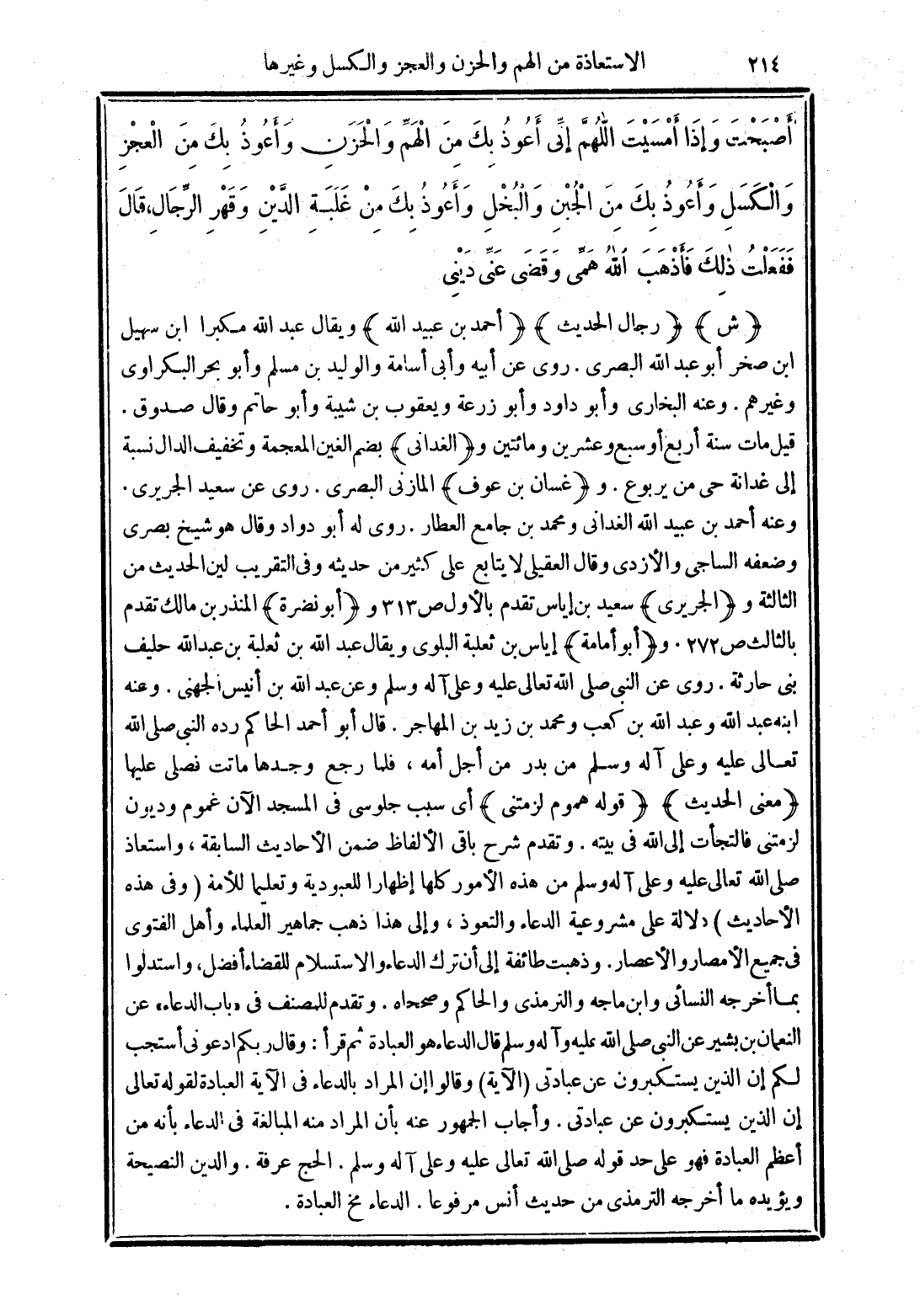 (قوله هموم لزمتني) أي سبب جلوسي في المسجد الآن غموم وديون لزمتني فالتجأت إلى الله في بيته. وتقدم شرح باقي الألفاظ ضمن الأحاديث السابقة, واستعاذ صلى الله تعالى عليه وعلى آله وسلم من هذه الأمور كلها إظهارًا للعبودية وتعليما للأمة