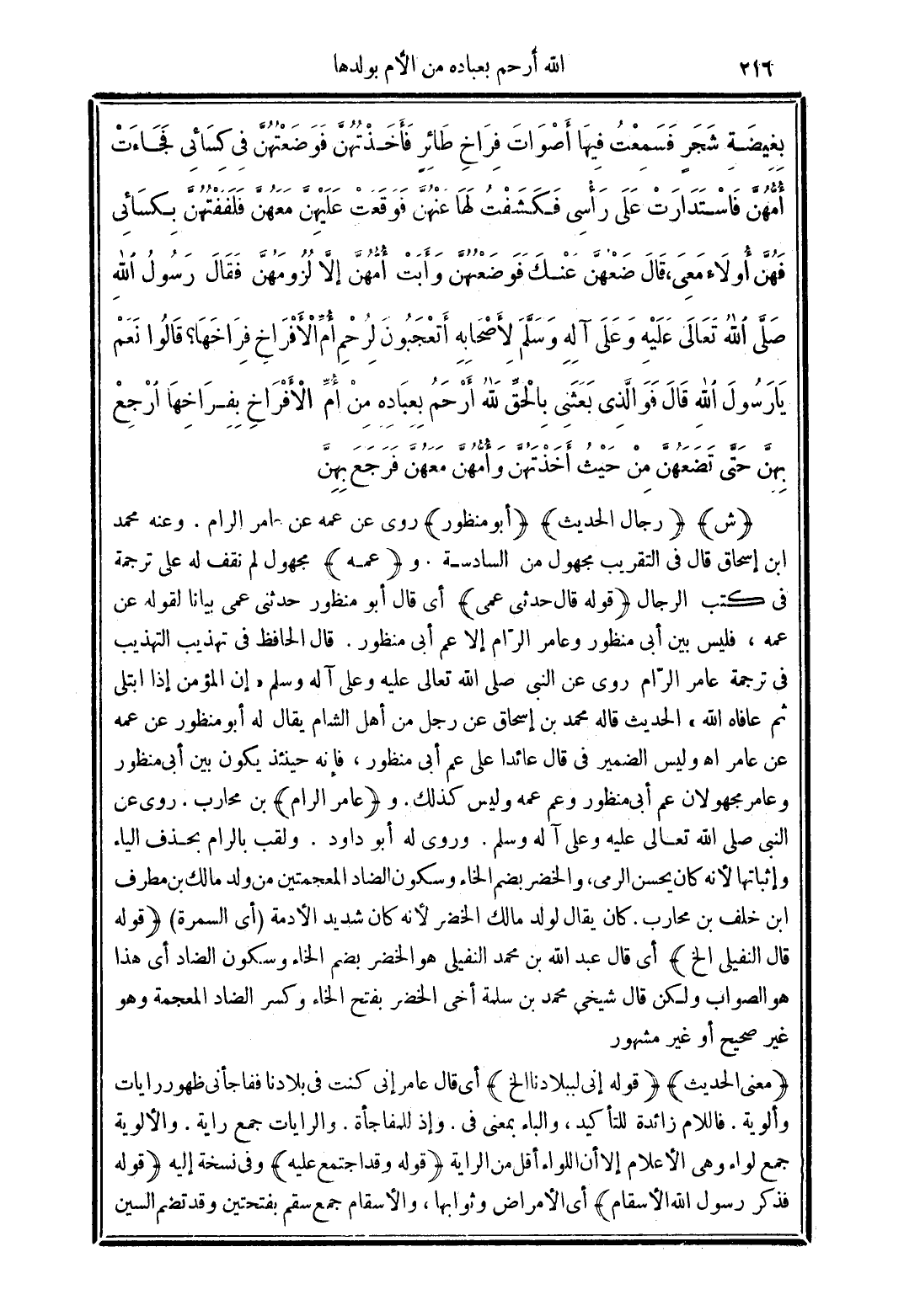بِغَيْضَةِ شَجَرٍ فَسَمِعْتُ فِيهَا أَصْوَاتَ فِرَاخِ طَائِرٍ فَأَخَذْتُهُنَّ فَوَضَعْتُهُنَّ فِي كِسَائِي فَجَاءَتْ أُمُّهُنَّ فَاسْتَدَارَتْ عَلَى رَأْسِي فَكَشَفْتُ لَهَا عَنْهُنَّ فَوَقَعَتْ عَلَيْهِنَّ مَعَهُنَّ فَلَفَفْتُهُنَّ بِكِسَائِي فَهُنَّ أُولاَءِ مَعِي. قَالَ "ضَعْهُنَّ عَنْكَ". فَوَضَعْتُهُنَّ وَأَبَتْ أُمُّهُنَّ إِلاَّ لُزُومَهُنَّ فَقَالَ رَسُولُ اللَّهِ -صَلَّى الله تَعَالَى عَلَيْهِ وَعَلَى آلِهِ وَسَلَّمَ- لأَصْحَابِهِ "أَتَعْجَبُونَ لِرُحْمِ أُمِّ الأَفْرَاخِ فِرَاخَهَا". قَالُوا نَعَمْ يَا رَسُولَ اللَّهِ -صَلَّى الله تَعَالَى عَلَيْهِ وَعَلَى آلِهِ وَسَلَّمَ-. قَالَ "فَوَالَّذِي بَعَثَنِي بِالْحَقِّ لَلَّهُ أَرْحَمُ بِعِبَادِهِ مِنْ أُمِّ الأَفْرَاخِ بِفِرَاخِهَا ارْجِعْ بِهِنَّ حَتَّى تَضَعَهُنَّ مِنْ حَيْثُ أَخَذْتَهُنَّ وَأُمُّهُنَّ مَعَهُنَّ". فَرَجَعَ بِهِنَّ.