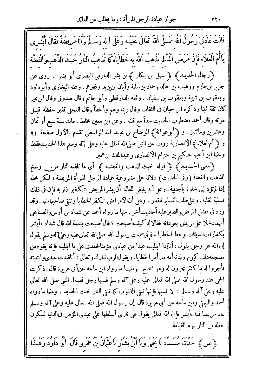 (وفي الحديث) دلالة علي مشروعية عيادة الرجل للمرأة المريضة, لكن محله إذا لم تؤد إلى خلوة بأجنبية. وعلي أنه ينبغي للعائد أن يبشر المريض بتكفير ذنوبه فإن في ذلك تسلية لقلبه. وعلى طلب التسليم للقدر. وعلى أن الأمراض تكفر الخطايا وتنقي صاحبها منها.
