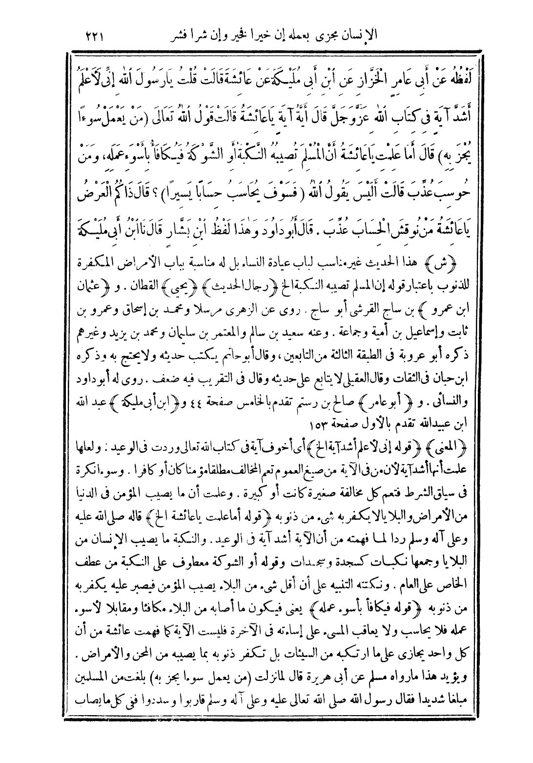 لَفْظُه- عَنْ أَبِي عَامِرٍ الْخَزَّازِ عَنِ ابْنِ أَبِي مُلَيْكَةَ عَنْ عَائِشَةَ قَالَتْ قُلْتُ يَا رَسُولَ اللَّهِ إِنِّي لأَعْلَمُ أَشَدَّ آيَةٍ فِي كِتَابِ الله عَزَّ وَجَلَّ قَالَ "أَيَّةُ آيَةٍ يَا عَائِشَةُ". قَالَتْ قَوْلُ اللَّهِ تَعَالَى (مَنْ يَعْمَلْ سُوءًا يُجْزَ بِهِ) قَالَ "أَمَا عَلِمْتِ يَا عَائِشَةُ أَنَّ الْمُؤْمِنَ تُصِيبُهُ النَّكْبَةُ أَوِ الشَّوْكَةُ فَيُكَافَأُ بِأَسْوَإِ عَمَلِهِ وَمَنْ حُوسِبَ عُذِّبَ". قَالَتْ أَلَيْسَ اللَّهُ يَقُولُ (فَسَوْفَ يُحَاسَبُ حِسَابًا يَسِيرًا) قَالَ "ذَاكُمُ الْعَرْضُ يَا عَائِشَةُ مَنْ نُوقِشَ الْحِسَابَ عُذِّبَ". قَالَ أَبُو دَاوُدَ وَهَذَا لَفْظُ ابْنِ بَشَّارٍ قَالَ أَنَا ابْنُ أَبِي مُلَيْكَةَ.