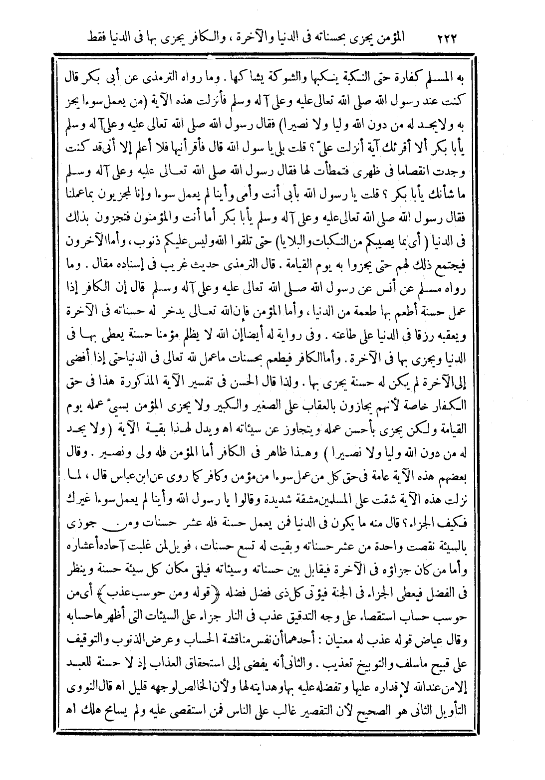 به المسلم كفارة حتى النكبة ينكبها والشوكة يشاكها. وما رواه الترمذي عن أبي بكر قال كنت عند رسول الله صلى الله عليه وعلى آله وسلم فأنزلت هذه الآية (من يعمل سوءًا يجز به ولا يجد له من دون الله وليًا ولا نصيرًا) فقال رسول الله صلى الله تعالى عليه وعلى آله وسلم يأبا بكر ألا أقرئك آية أنزلت عليّ؟ قلت بلى يا رسول الله قال فأقرأنيها فلا أعلم إلا أني قد كنت وجدت انقصامًا في ظهري فتمطأت لها فقال رسول الله صلى الله تعالى عليه وعلى آله وسلم ما شأنك يا أبا بكر؟ قلت يا رسول الله بأبي أنت وأمي وأينا لم يعمل سوءًا وإنا لمجزيون بما عملنا فقال رسول الله صلى الله تعالى عليه وعلى آله وسلم يا أبا بكر أما أنت والمؤمنون فتجزون بذلك في الدنيا (أي بما يصيبكم من النكبات والبلايا) حتى تلقوا الله وليس عليكم ذنوب، وأما الآخرون فيجتمع ذلك لهم حتى يجزوا به يوم القيامة. قال الترمذي حديث غريب في إسناده مقال.