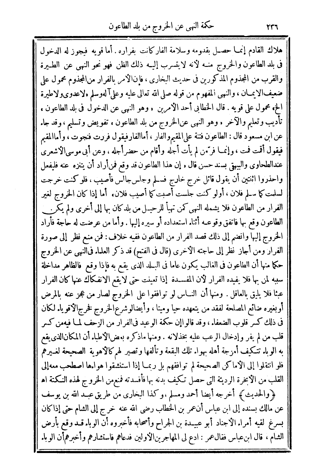 قال الخطابي أحد الأمرين "وهو النهي عن الدخول في بلد الطاعون" تأديب وتعلم والآخر "وهو النهي عن الخروج من بلد الطاعون" تفويض وتسلم, وقد جاء عن ابن مسعود قال: الطاعون فتنة على المقيم والفار, أما الفار فيقول فررت فنجوت, وأما المقيم فيقول أقمت فمت, وإنما فر من لم يأت أجله وأقام من حضر أجله, وعن أبي موسى الأشعري عند الطحاوي والبيهقي بسند حسن قال "إن هذا الطاعون قد وقع فمن أراد أن يتنزه عنه فليفعل واحذروا اثنتين أن يقول قائل خرج خارج فسلم وجلس جالس فأصيب, فلو كنت خرجت لسمت كما سلم فلان, أو لو كنت جلست أصبت كما أصيب فلان" أما إذا كان الخروج لغير الفرار من الطاعون وقع بها فاتفق وقوعه أثناء استعداده أو سيره إليها.