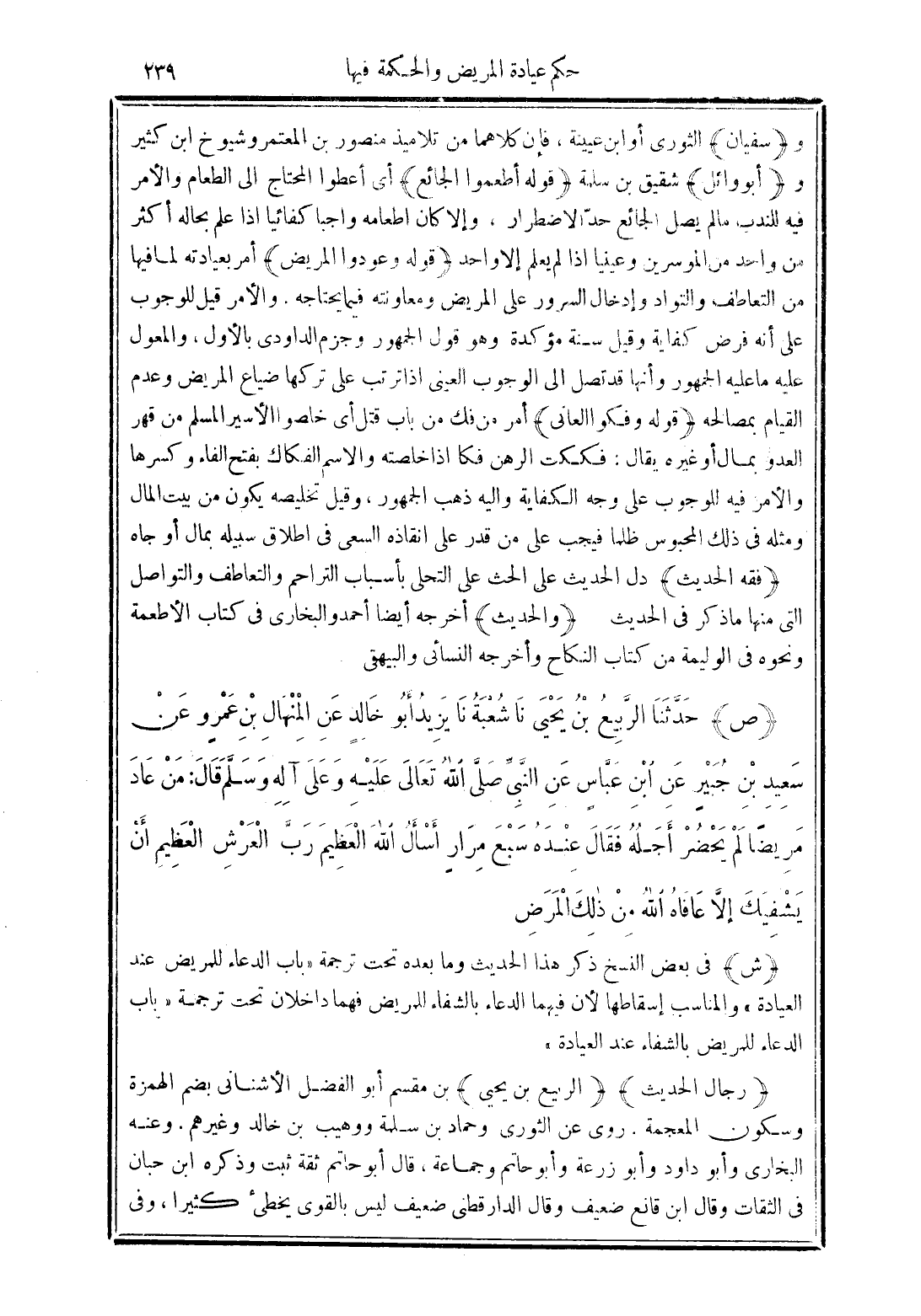 (ص) حَدَّثَنَا الرَّبِيعُ بْنُ يَحْيَى نَا شُعْبَةُ نَا يَزِيدُ أَبُو خَالِدٍ عَنِ الْمِنْهَالِ بْنِ عَمْرٍو عَنْ سَعِيدِ بْنِ جُبَيْرٍ عَنِ ابْنِ عَبَّاسٍ عَنِ النَّبِيِّ -صَلَّى الله تَعَالَى عَلَيْهِ وَعَلَى آلِهِ وَسَلَّمَ- قَالَ "مَنْ عَادَ مَرِيضًا لَمْ يَحْضُرْ أَجَلُهُ فَقَالَ عِنْدَهُ سَبْعَ مِرَارٍ أَسْأَلُ اللَّهَ الْعَظِيمَ رَبَّ الْعَرْشِ الْعَظِيمِ أَنْ يَشْفِيَكَ إِلاَّ عَافَاهُ اللَّهُ مِنْ ذَلِكَ الْمَرَضِ".