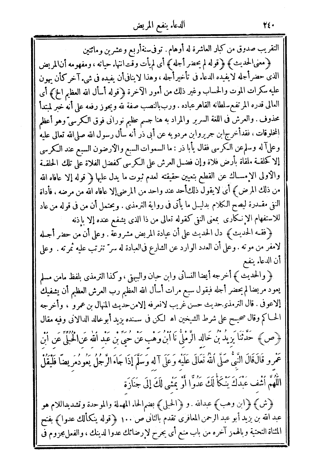 (والحديث) أخرجه أيضًا النسائي وابن حبان والبيهقي, وكذا الترمذي بلفظ ما من مسلم يعود مريضًا لم يحضر أجله فيقول سبع مرات أسأل الله العظيم رب العرش العظيم أن يشفيك إلا عوفي. قال الترمذي حديث حسن غريب لا نعرفه إلا من حديث المنهال بن عمرو , وأخرجه الحاكم وقال صحيح على شرط الشيخين اهـ لكن في سنده يزيد أبو خالد الدالاني وفيه مقال
