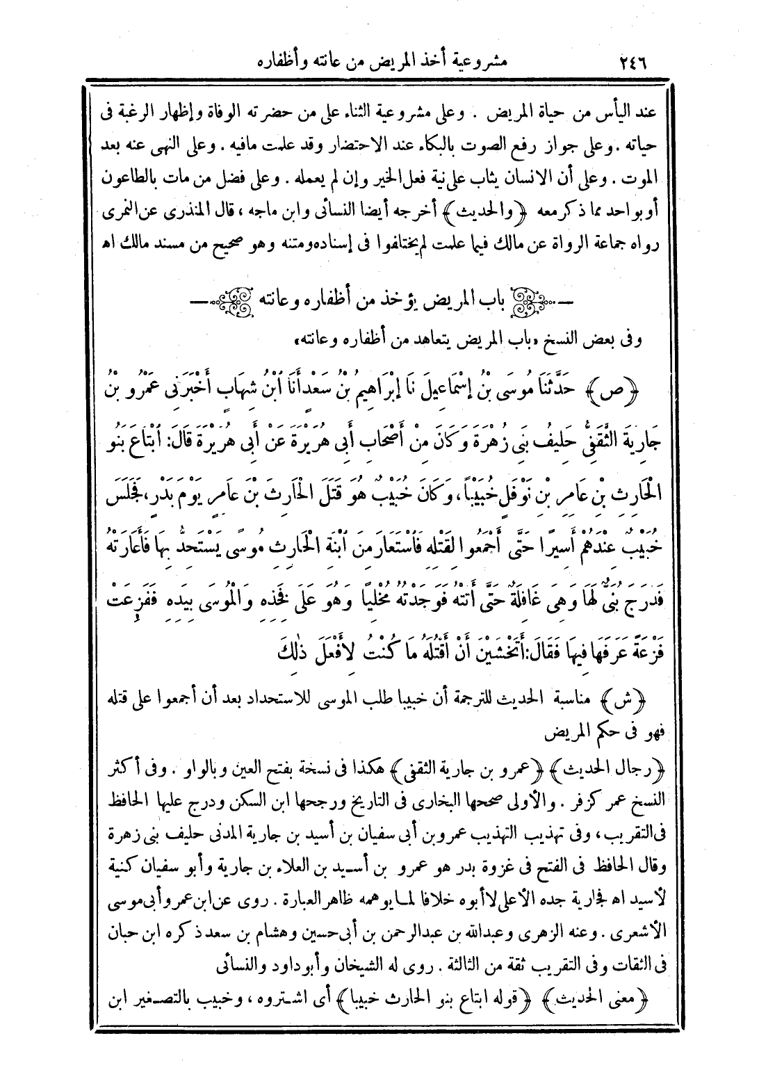 عند اليأس من حياة المريض. وعلى مشروعية الثناء على من حضرته الوفاة وإظهار الرغبة في حياته. وعلى جواز رفع الصوت بالبكاء عند الاحتضار وقد علمت ما فيه "وعلى النهي عنه بعد الموت. وعلى أن الإنسان يثاب على نية فعل الخير وإن لم يعمله. وعلى فضل من مات بالطاعون أو بواحد مما ذكر معه