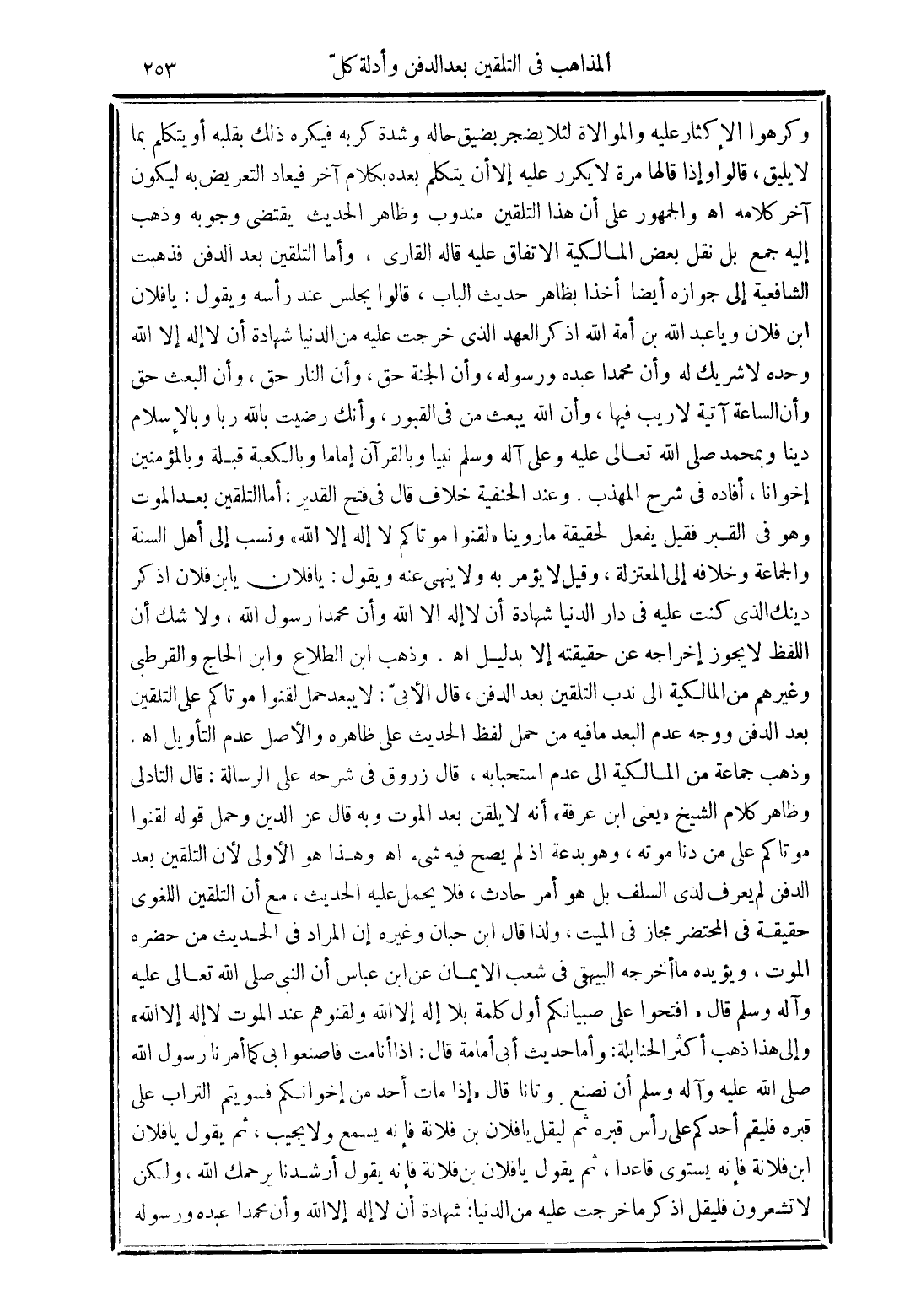 وذهب ابن الطلاع وابن الحاج والقرطبي وغيرهم من المالكية إلى ندب التلقين بعد الدفن, قال الأبيّ: لا يبعد حمل لقنوا موتاكم على التلقين بعد الدفن ووجه عدم البعد ما فيه من حمل لفظ الحديث على ظاهره والأصل عدم التأويل. وذهب جماعة من المالكية إلى عدم استحبابه, قال زروق في شرحه على الرسالة: قال التادلي وظاهر كلام الشيخ "يعني ابن عرفه" أنه لا يلقن بعد الموت وبه قال عز الدين وحمل قوله لقنوا موتاكم على من دنا موته, وهو بدعة إذ لم يصح فيه شيء وهذا هو الأولى لأن التلقين بعد الدفن لم يعرف لدى السلف بل هو أمر حادث, فلا يحمل عليه الحديث, مع أن التلقين اللغوي حقيقة في المختصر مجاز في الميت ولذا قال ابن حبان وغيره ان المراد في الحديث من حضره الموت, ويؤيده ما أخرجه البيهقي في شعب الإيمان عن ابن عباس أن النبي صلى الله تعالى عليه وعلى آله وسلم قال "افتحوا على صبيانكم أول كلمة بلا إله إلا الله ولقنوهم عند الموت لا إله إلا الله" وإلى هذا ذهب أكثر الحنابلة: وأما حديث أبي أمامة قال: إذا أنا مت فأصنعوا بي كما أمرنا رسول الله صلى الله تعالى عليه وعلى آله وسلم أن نصنع. بموتانا قال "إذا مات أحد من إخوانكم فسويتم التراب على قبره فليقم أحدكم على رأس قبره ثم ليقل يا فلان بن فلانة فإنه يسمع ولا يجيب, ثم يقول يا فلان ابن فلانة فإنه يستوى قاعدًا, ثم يقول يا فلان بن فلانة فإنه يقول ارشدنا يرحمك الله, ولكن لا تشعرون فليقل اذكر ما خرجت عليه من الدنيا: شهادة أن لا إله إلا الله وأن محمدًا عبده ورسوله
